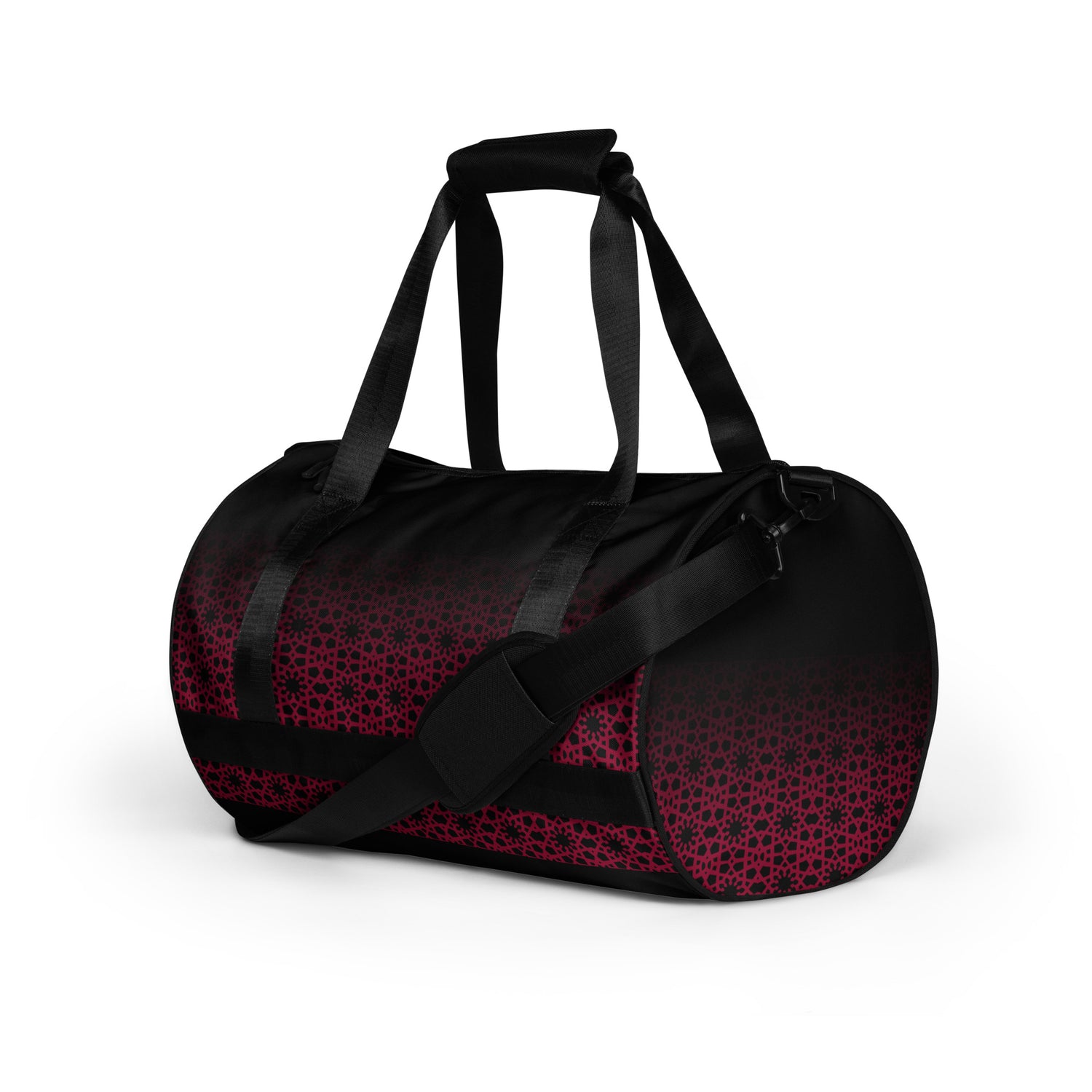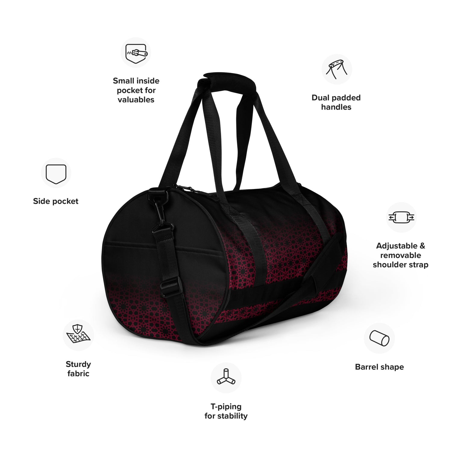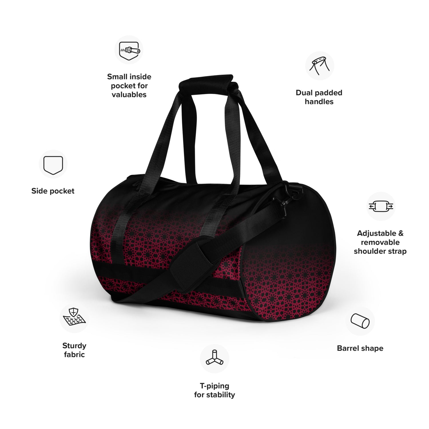 Ready to get your fitness on? Add some punch to pumping iron with this all-over print gym bag. Made from 100% polyester and sturdy, water-resistant fabric, this bag is fun meets function. And it’s got pockets!
