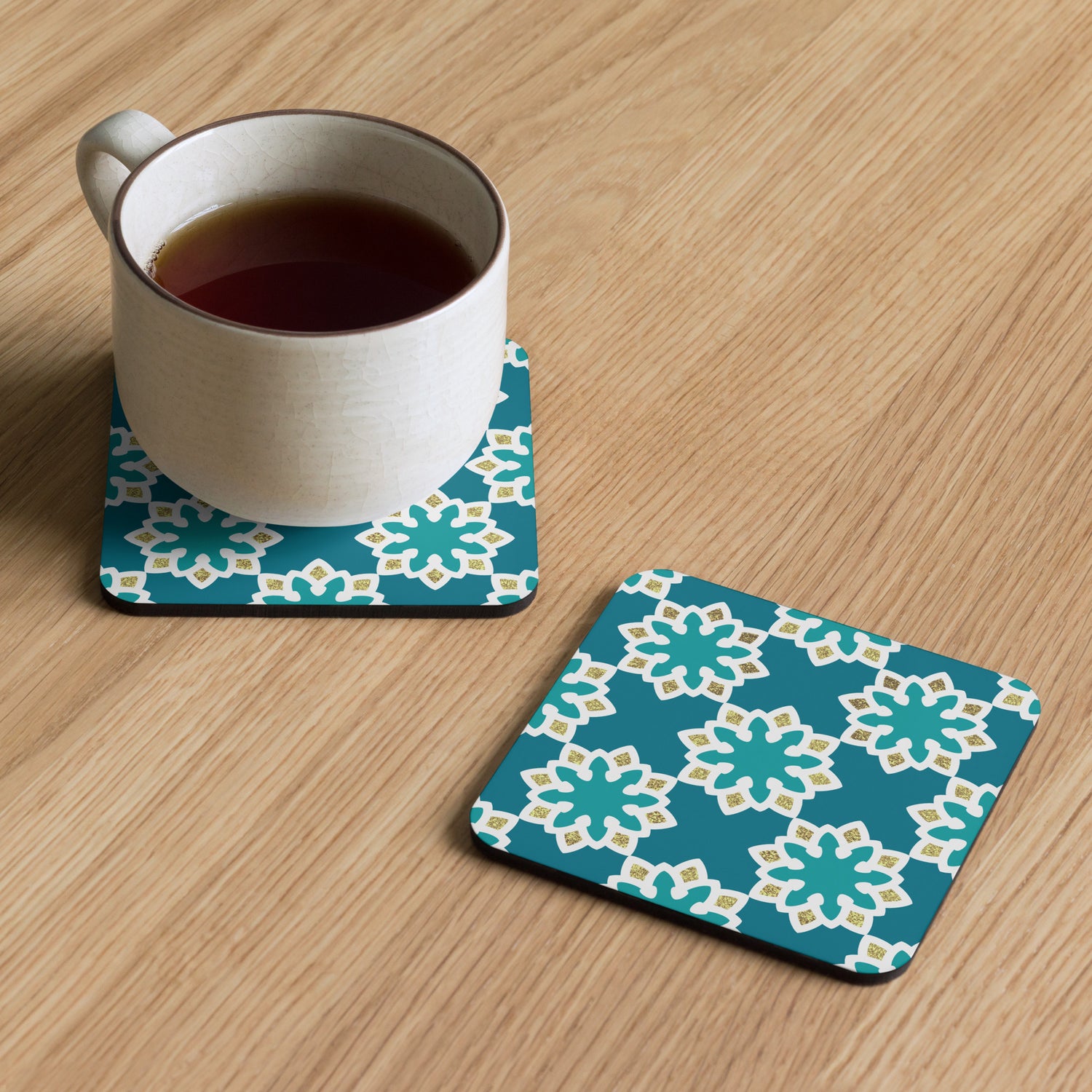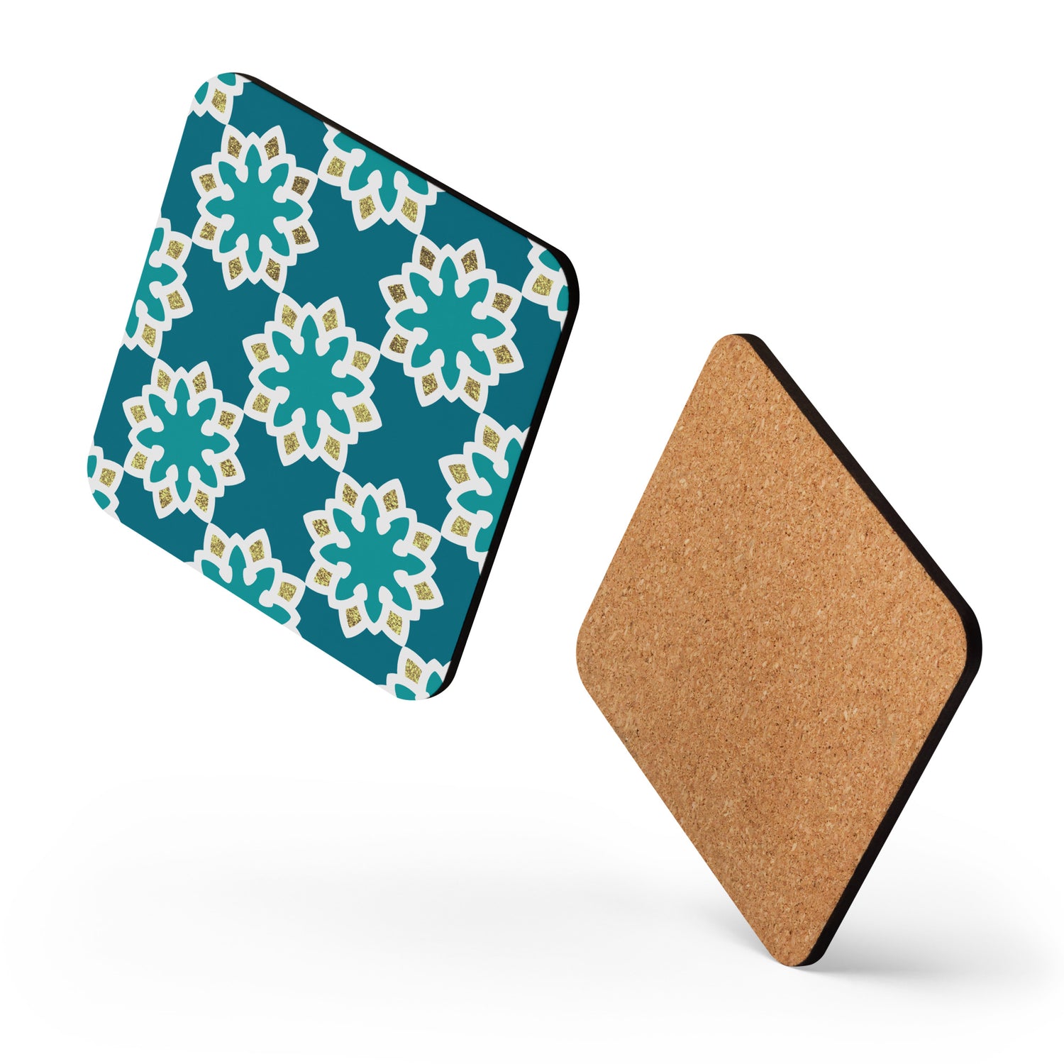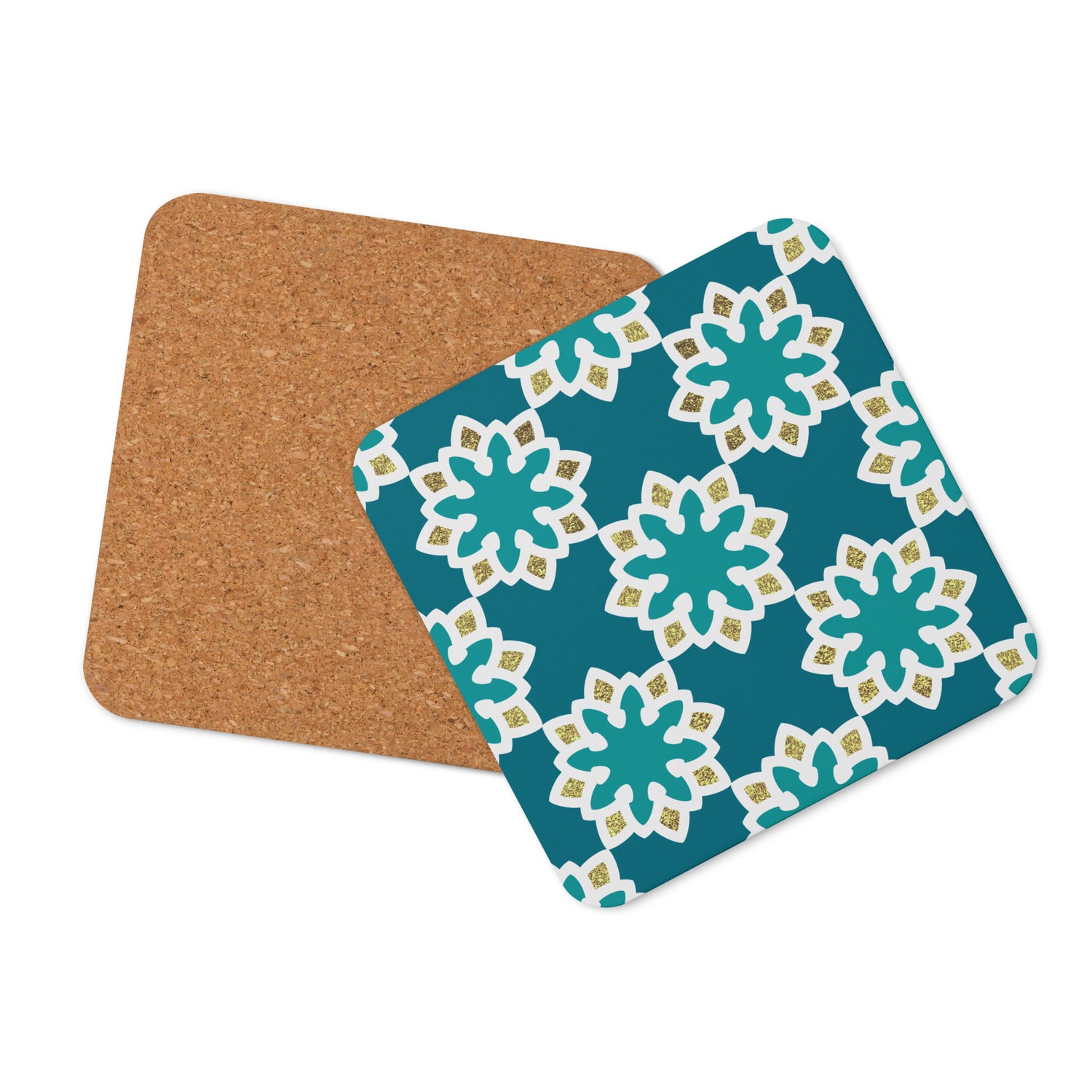 Arabesque flowers in Aqua and gold Cork-back coaster