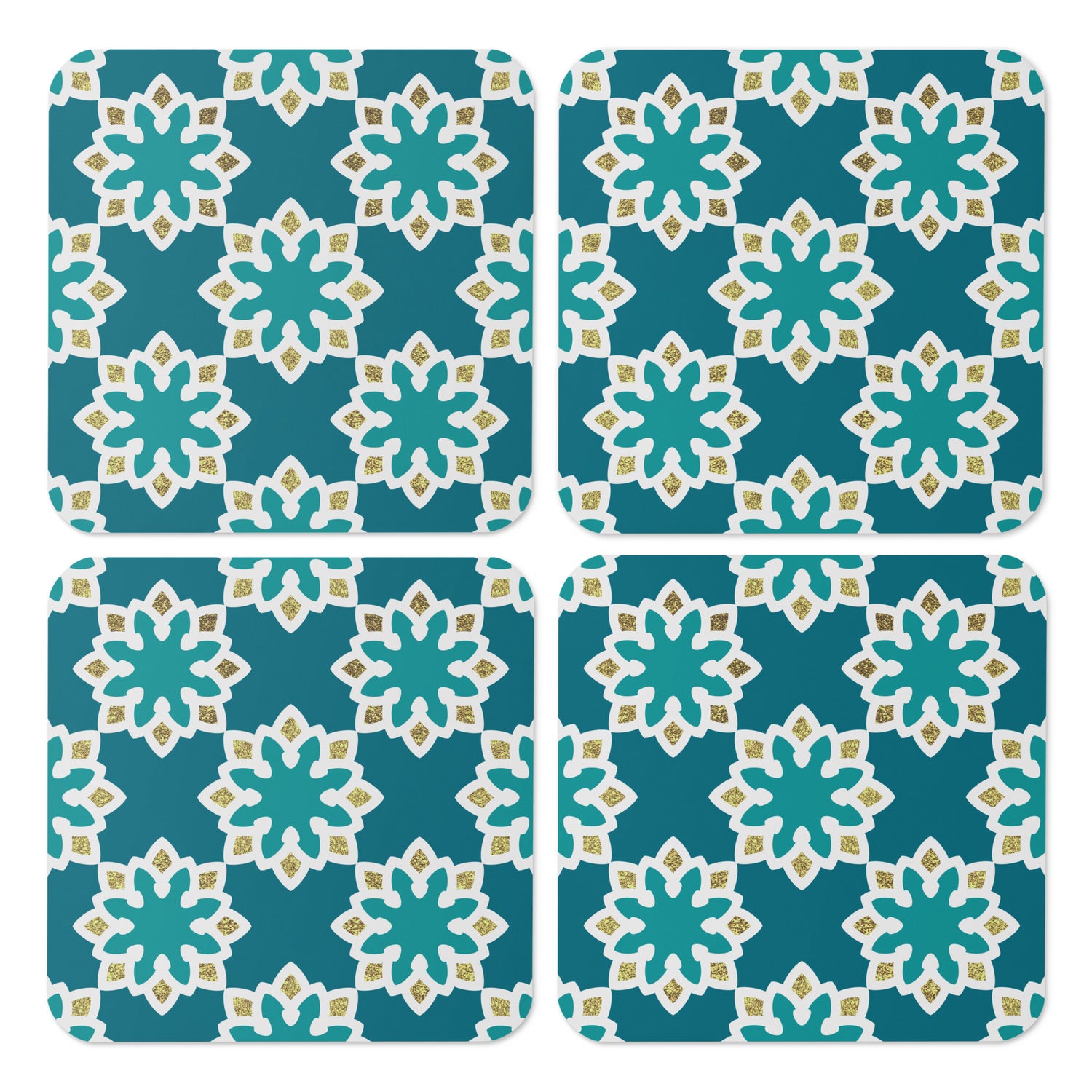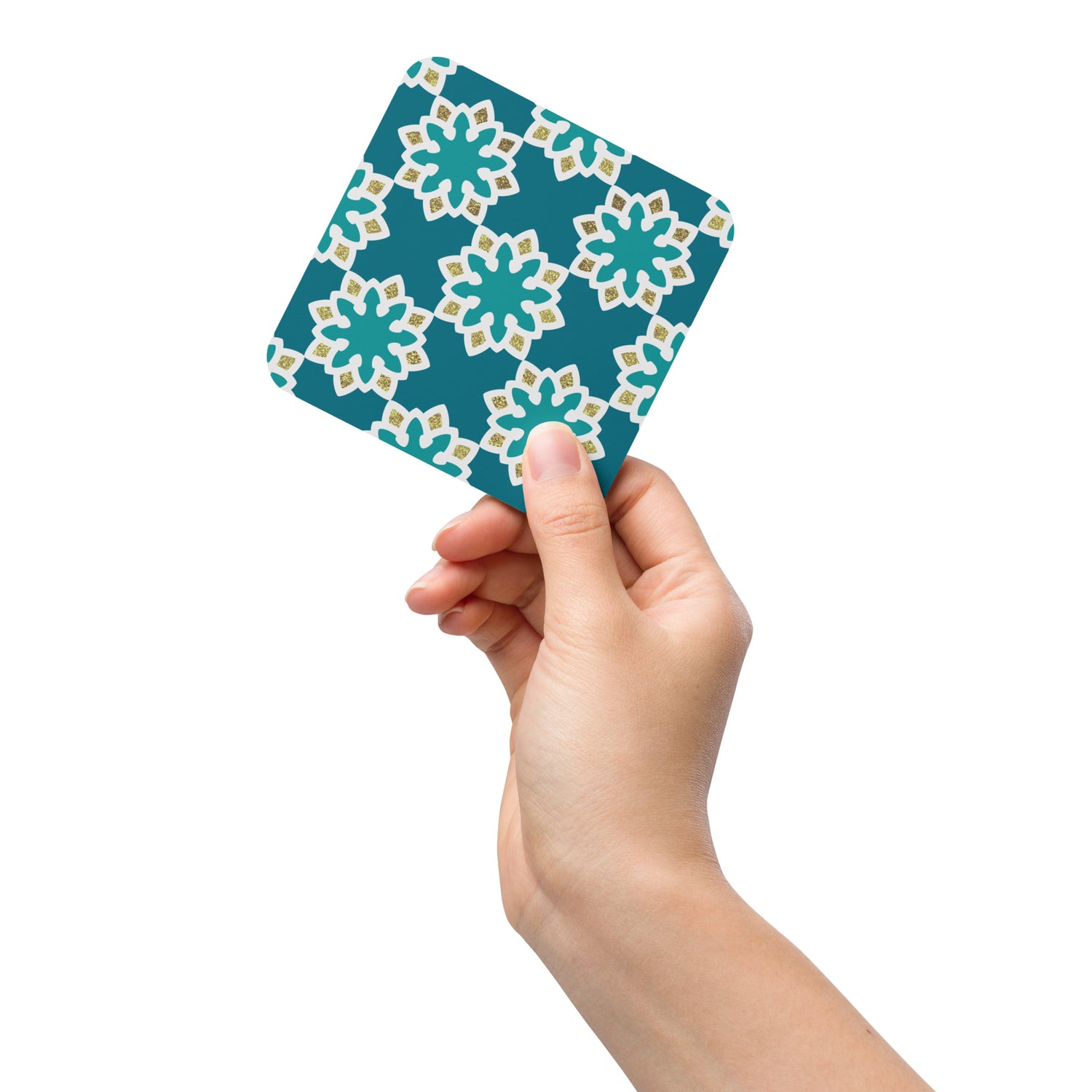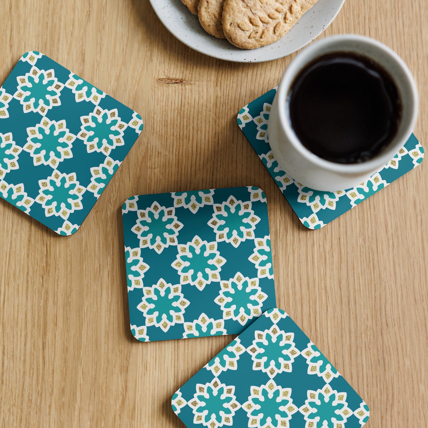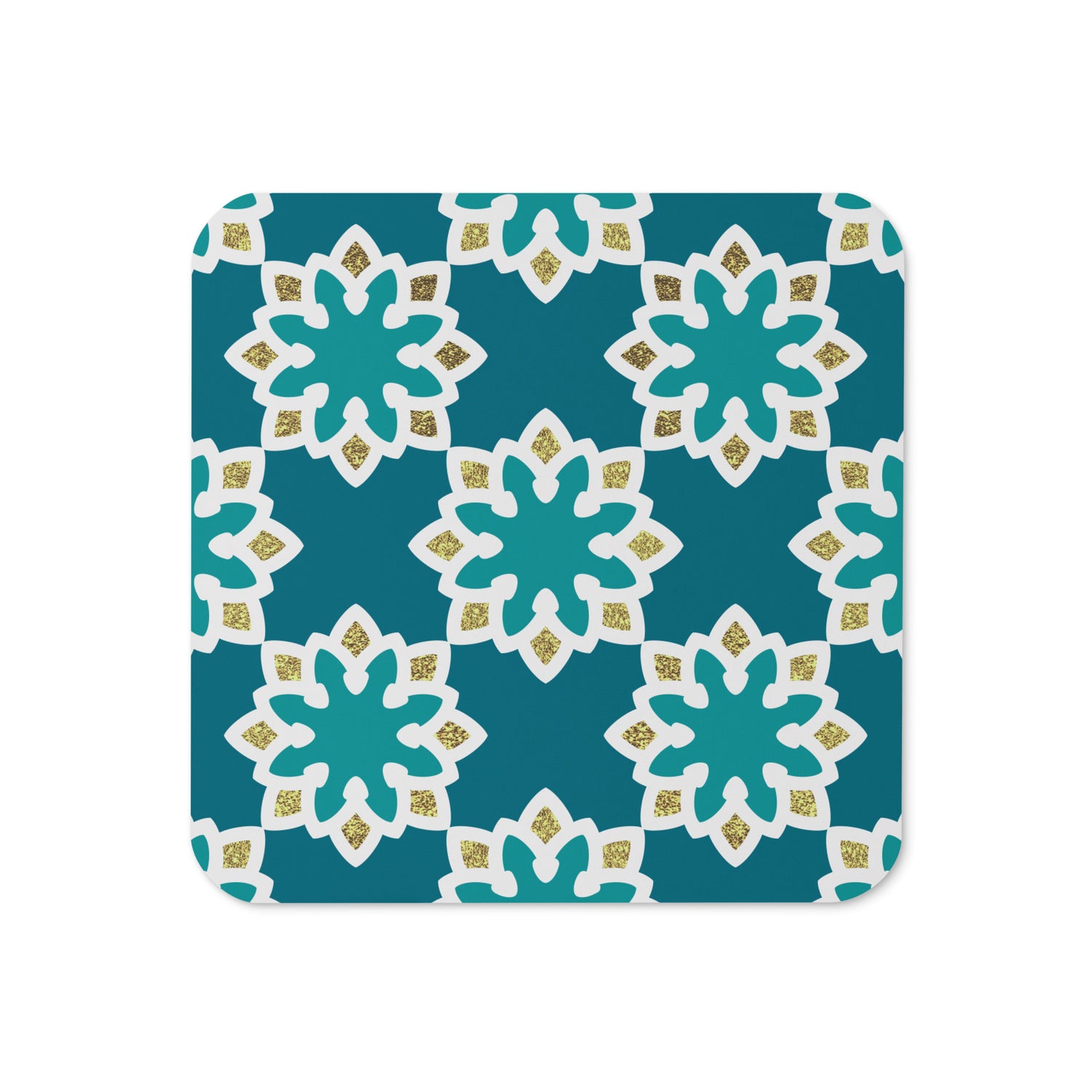 Arabesque flowers in Aqua and gold Cork-back coaster