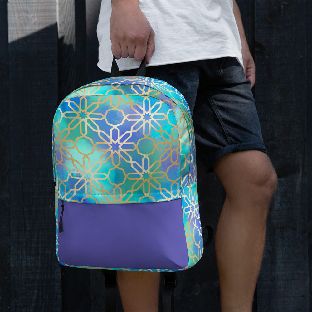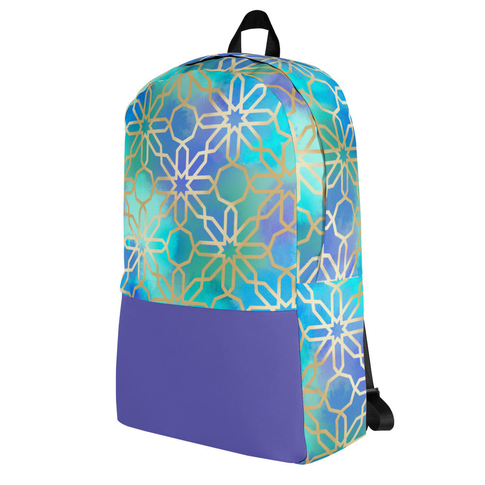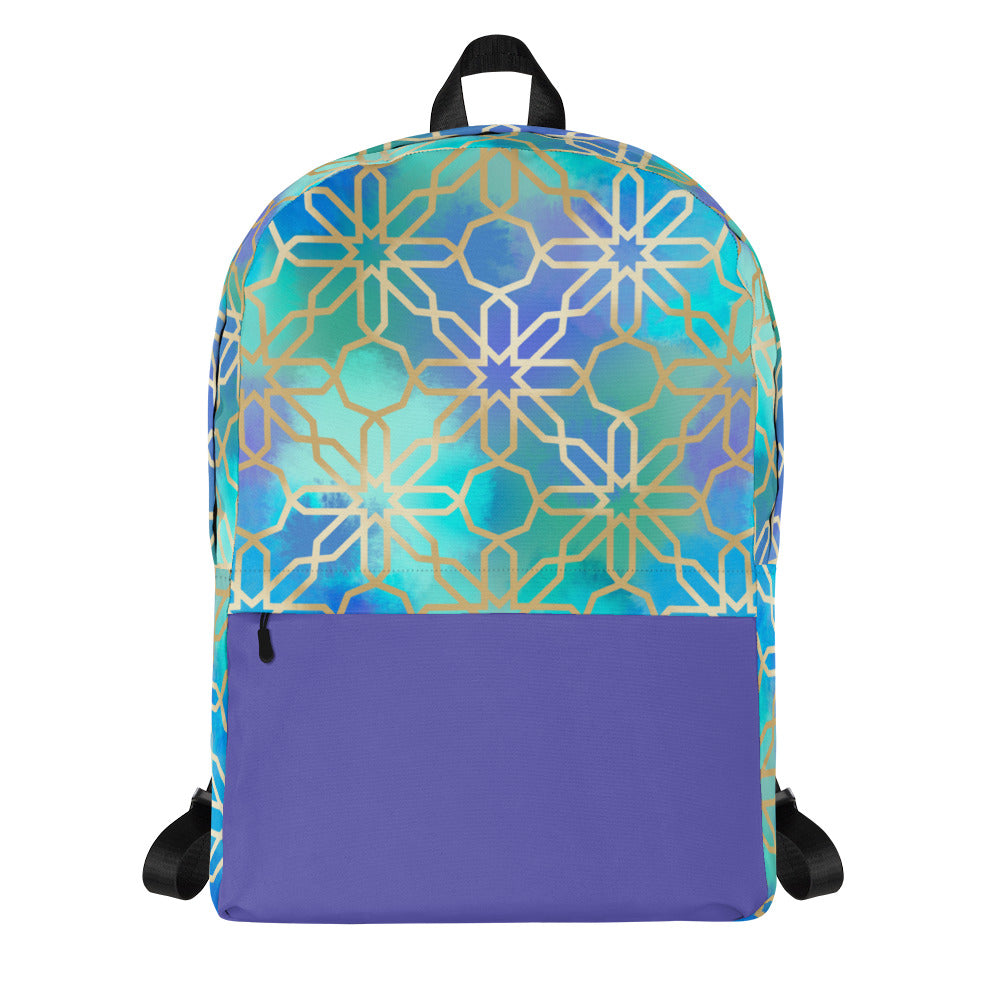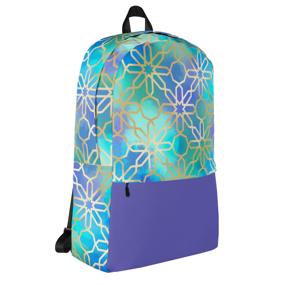 This medium size backpack featuring artwork inspired by Arabian and Moorish Architecture is just what you need to express some international style during the day to day, or even your next trip! The pockets (including one for your laptop) give plenty of room for all your necessities, while the water-resistant material will protect them from the weather.