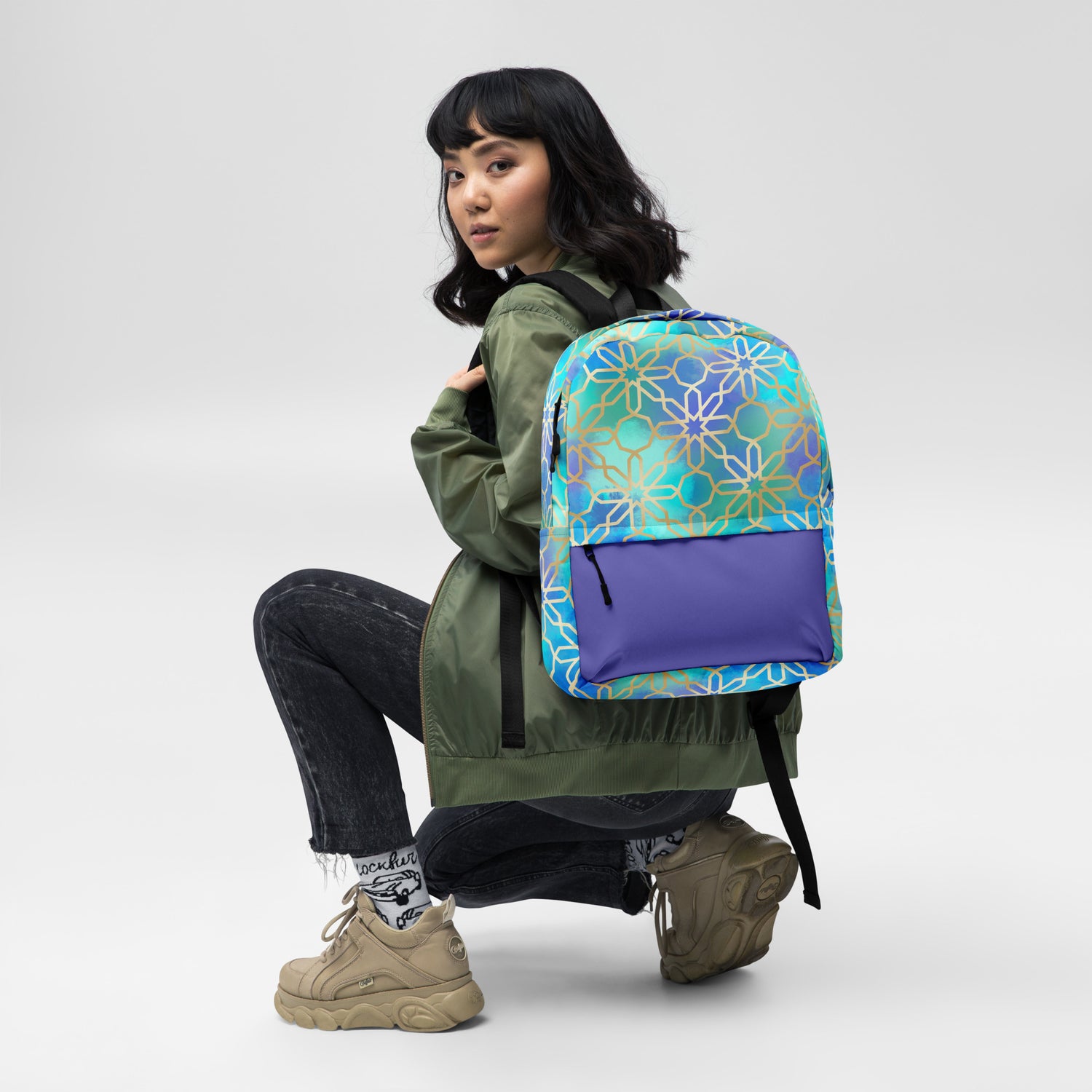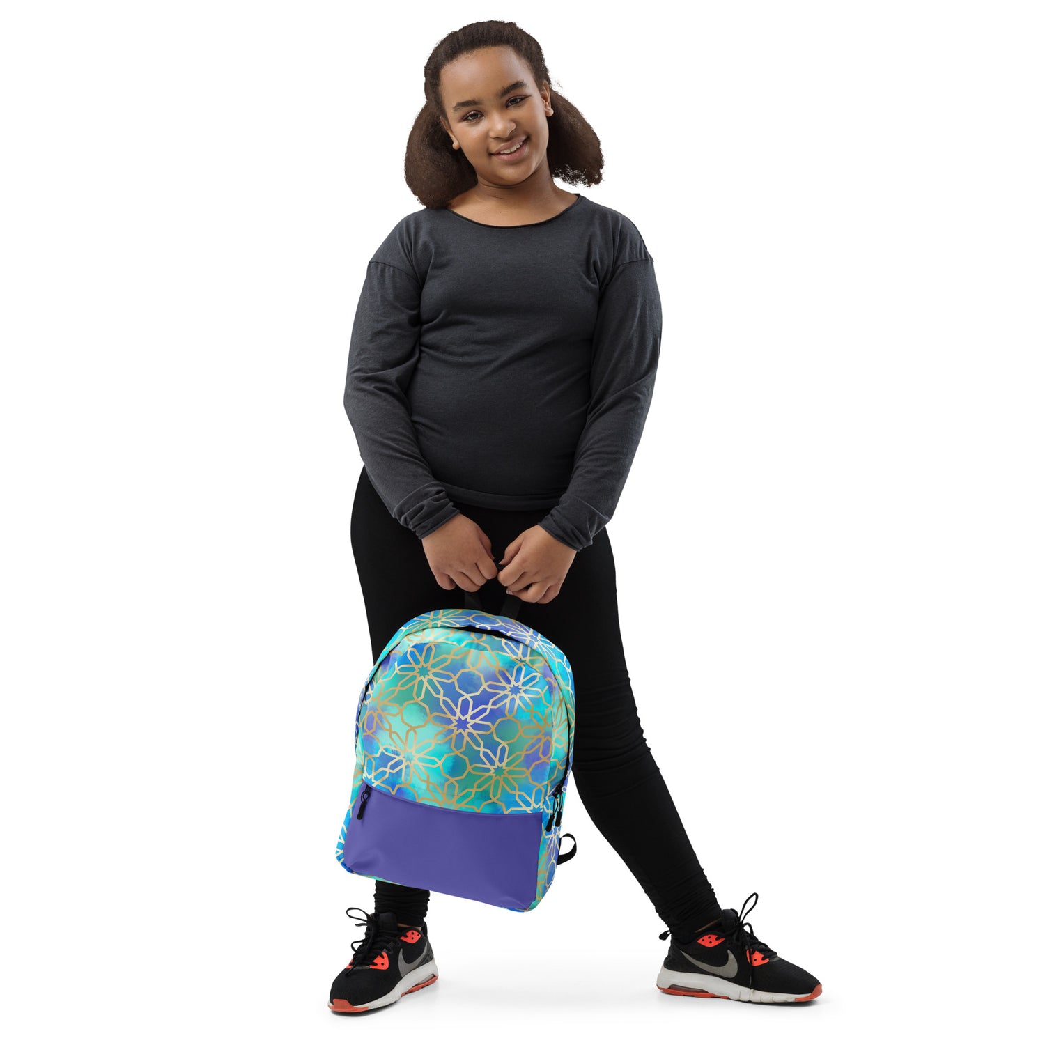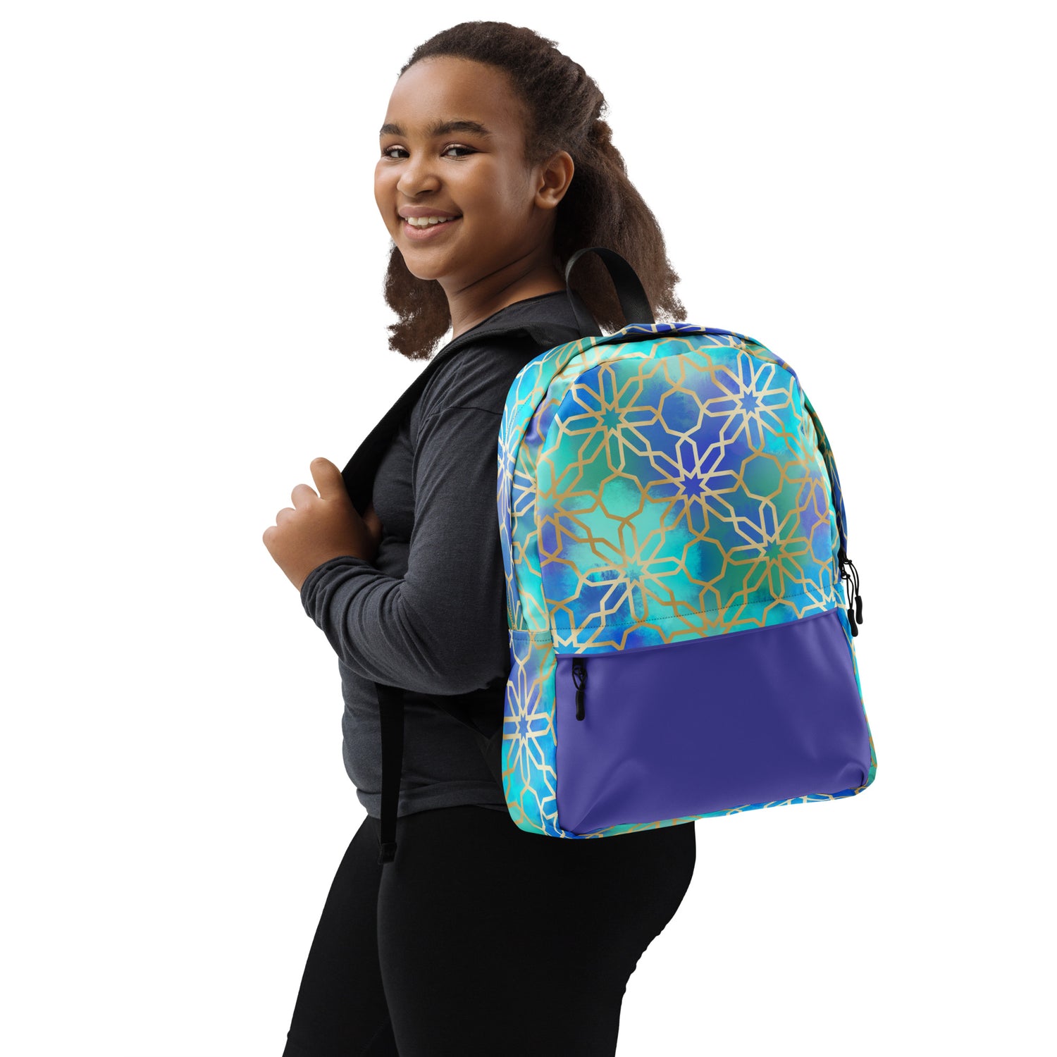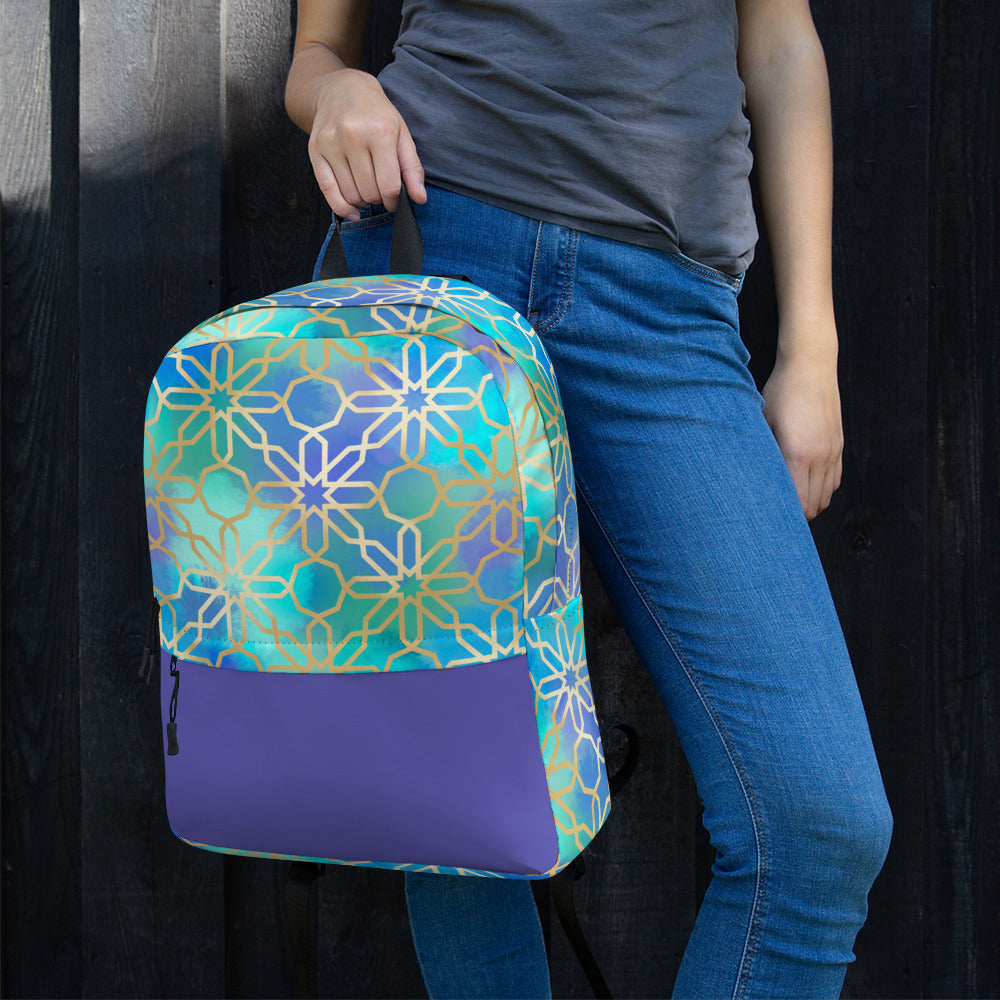 This medium size backpack featuring artwork inspired by Arabian and Moorish Architecture is just what you need to express some international style during the day to day, or even your next trip! The pockets (including one for your laptop) give plenty of room for all your necessities, while the water-resistant material will protect them from the weather.