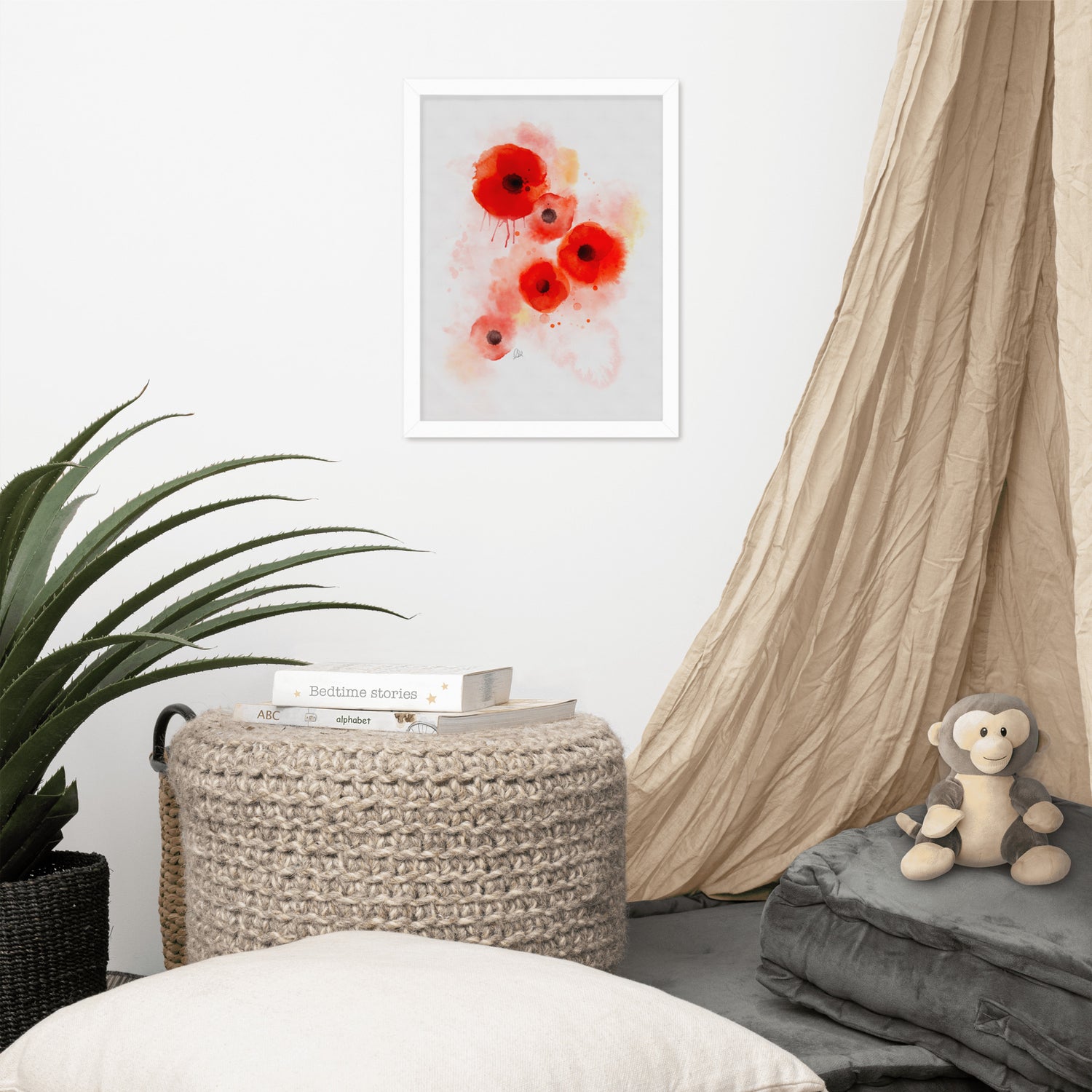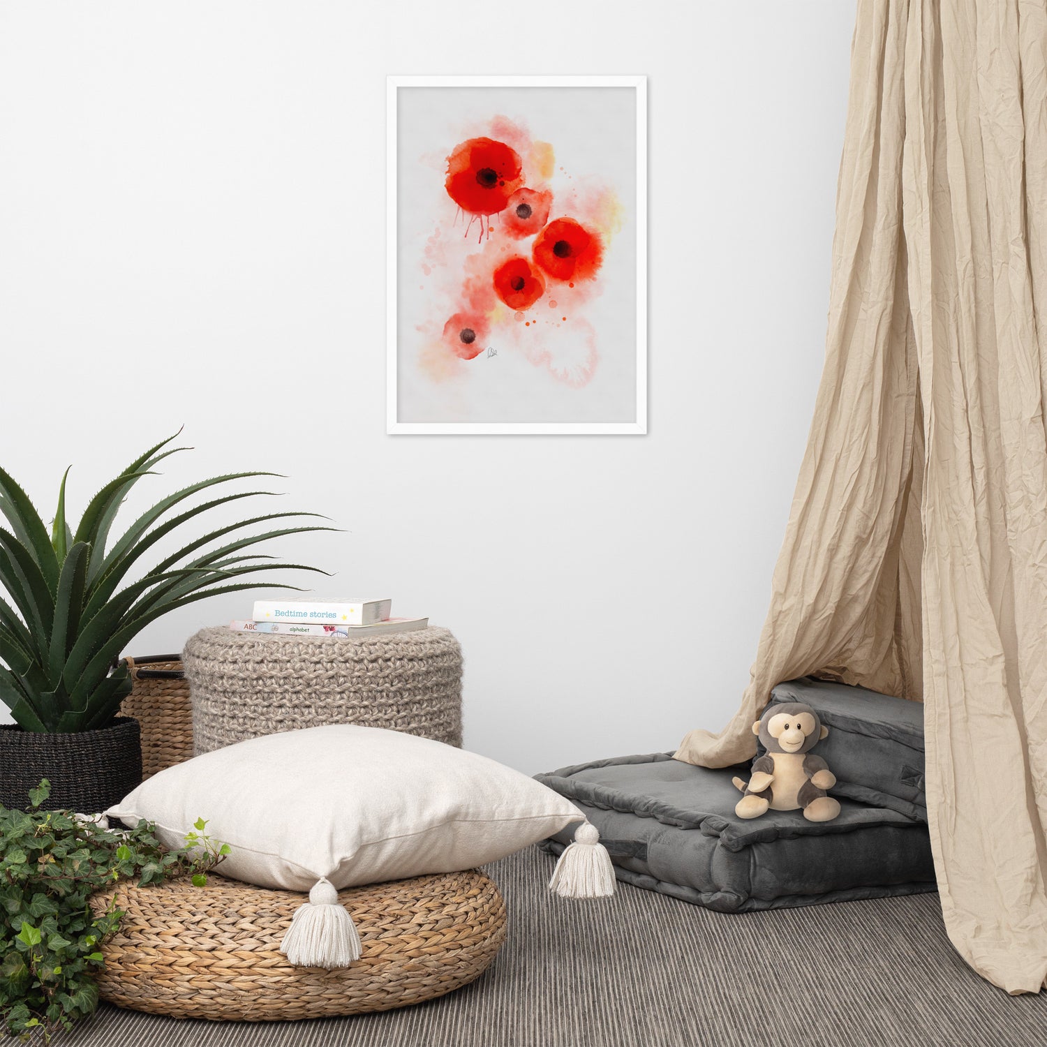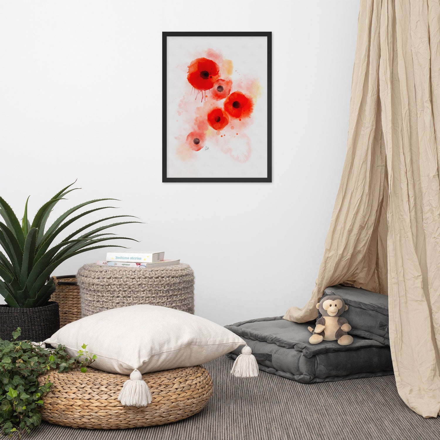 This Framed Coquelicot Poppies Watercolor artwork is part of the French Watercolor Collection. These Coquelicots bloom all over France in the spring decorating roadsides and setting fields ablaze with crimson, each bloom reaching in unison for the passing breeze. Yet if picked, these blossoms wilt immediately, so I created this abstract watercolor so you can keep these forever-blooms. These delicate flowers quicky become a core memory of the French experience.