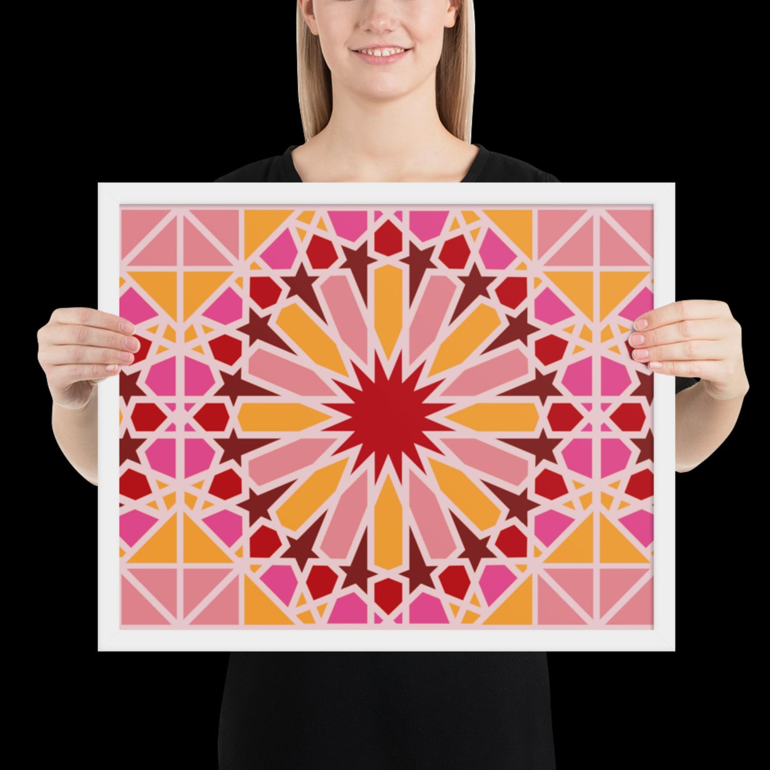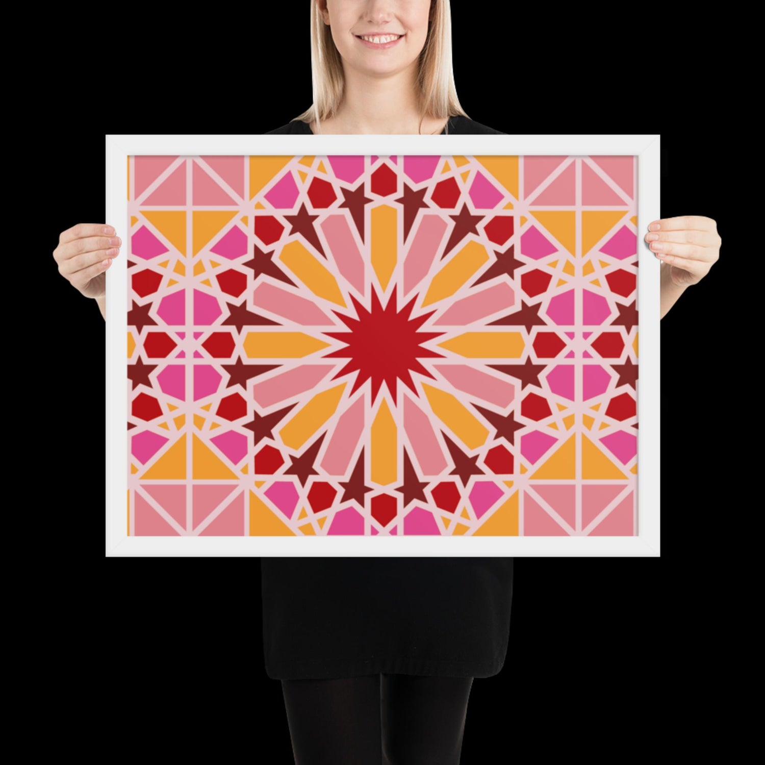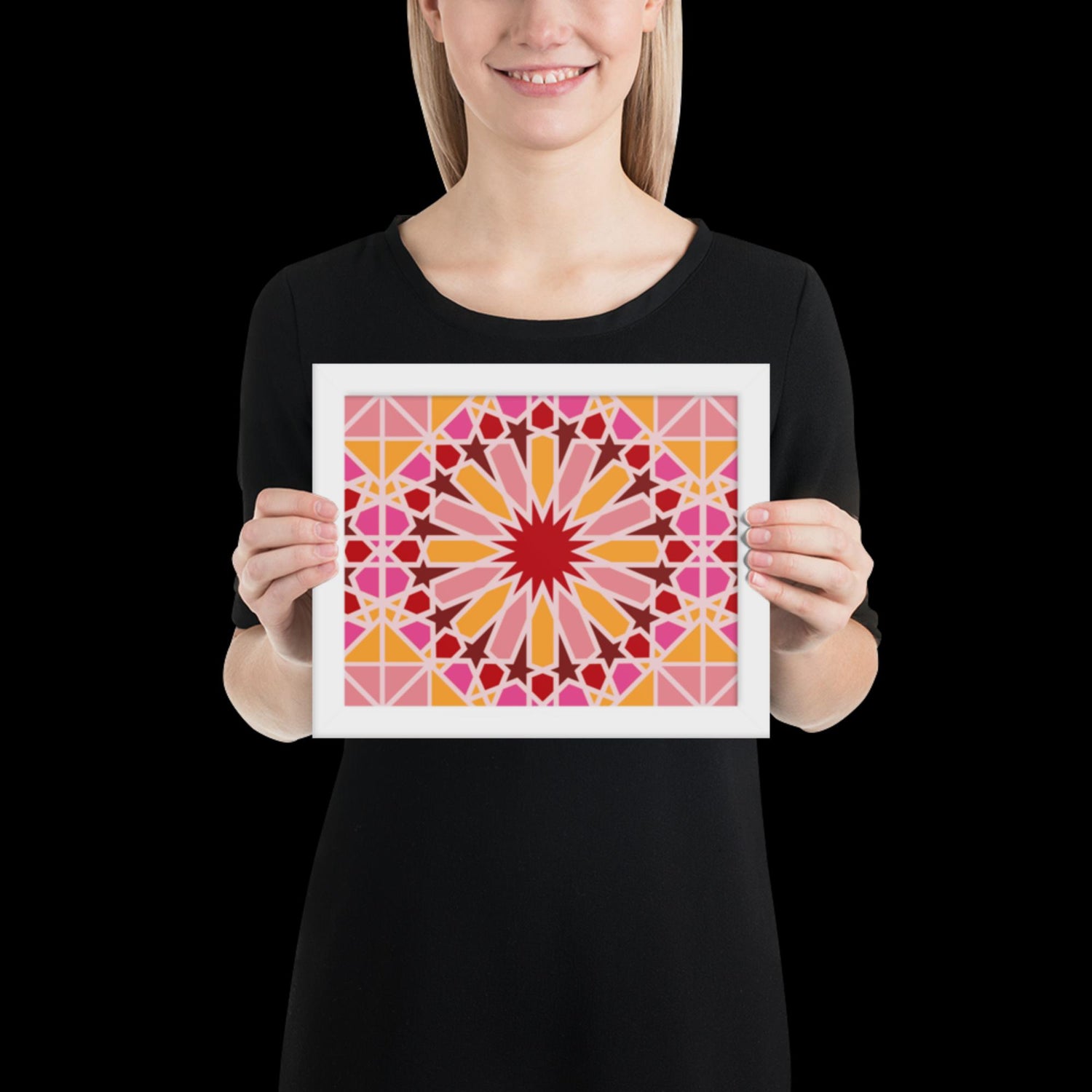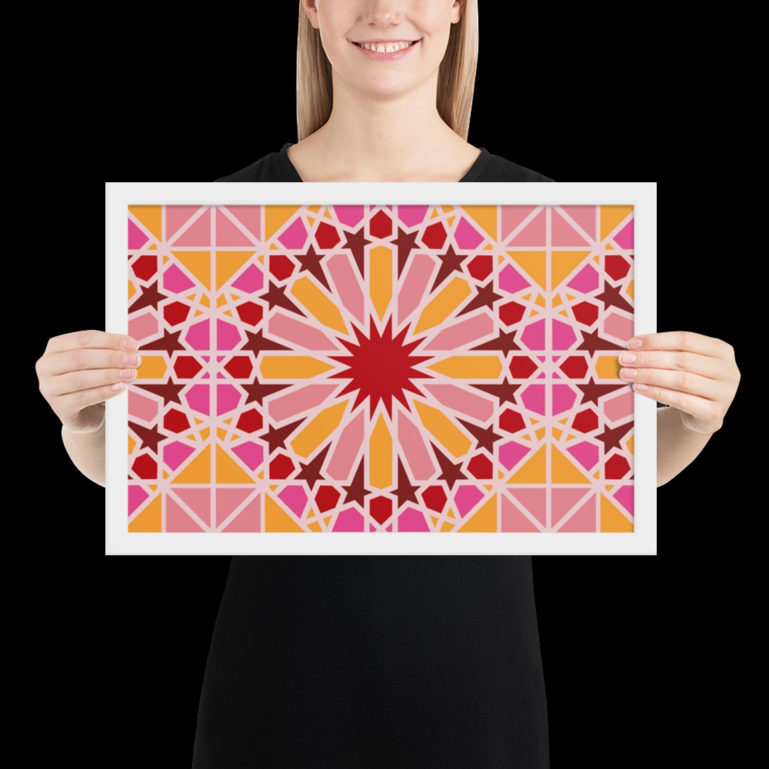 Make a statement in any room with this framed poster inspired by traditional Arabian architecture featuring geometric artwork in a bright modern color palette, printed on thick matte paper. The matte black frame that's made from wood from renewable forests adds an extra touch of class.