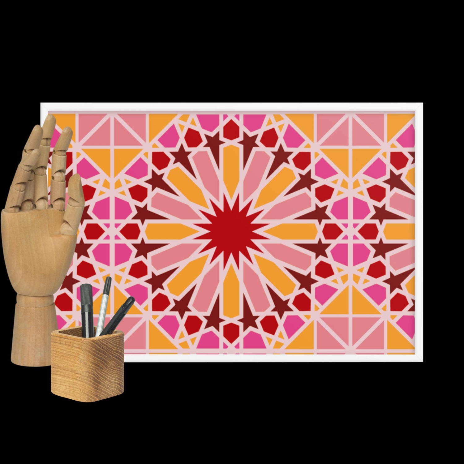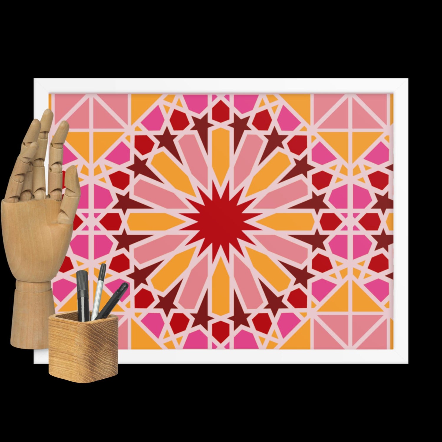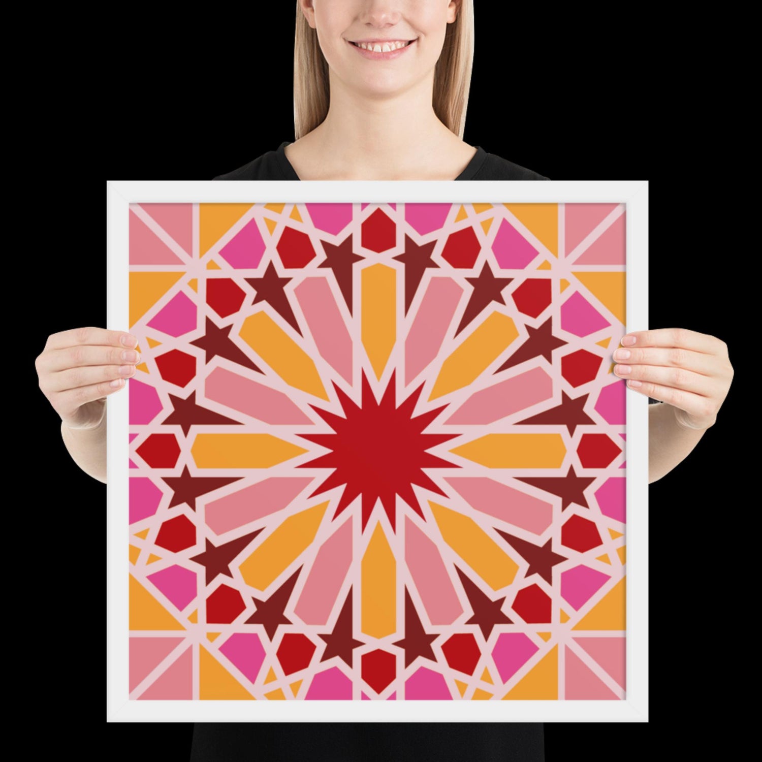 Make a statement in any room with this framed poster inspired by traditional Arabian architecture featuring geometric artwork in a bright modern color palette, printed on thick matte paper. The matte black frame that's made from wood from renewable forests adds an extra touch of class.