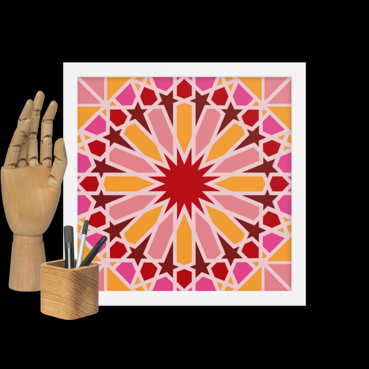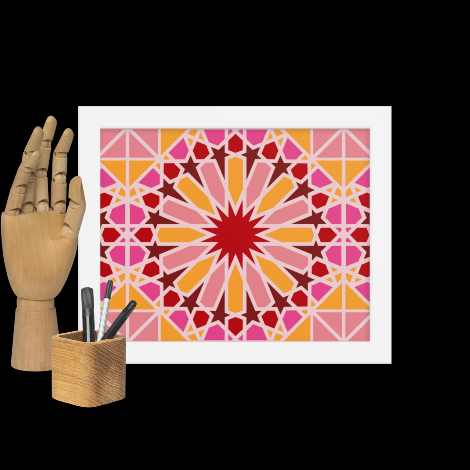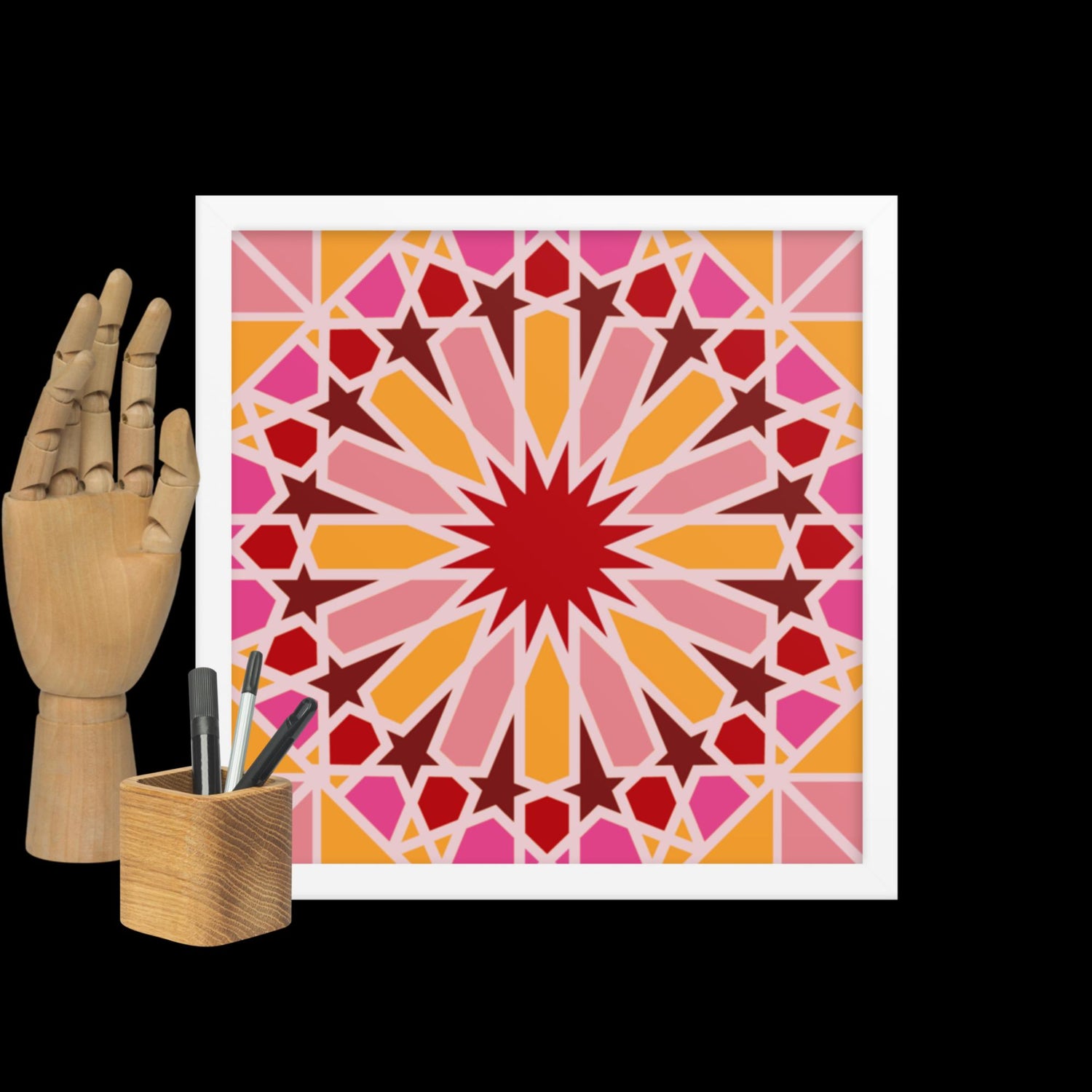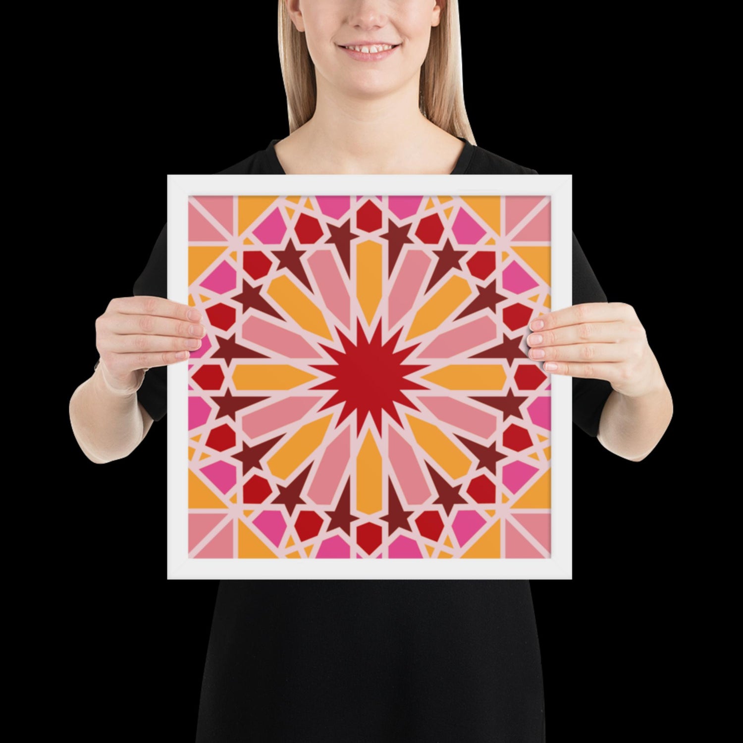 Make a statement in any room with this framed poster inspired by traditional Arabian architecture featuring geometric artwork in a bright modern color palette, printed on thick matte paper. The matte black frame that's made from wood from renewable forests adds an extra touch of class.