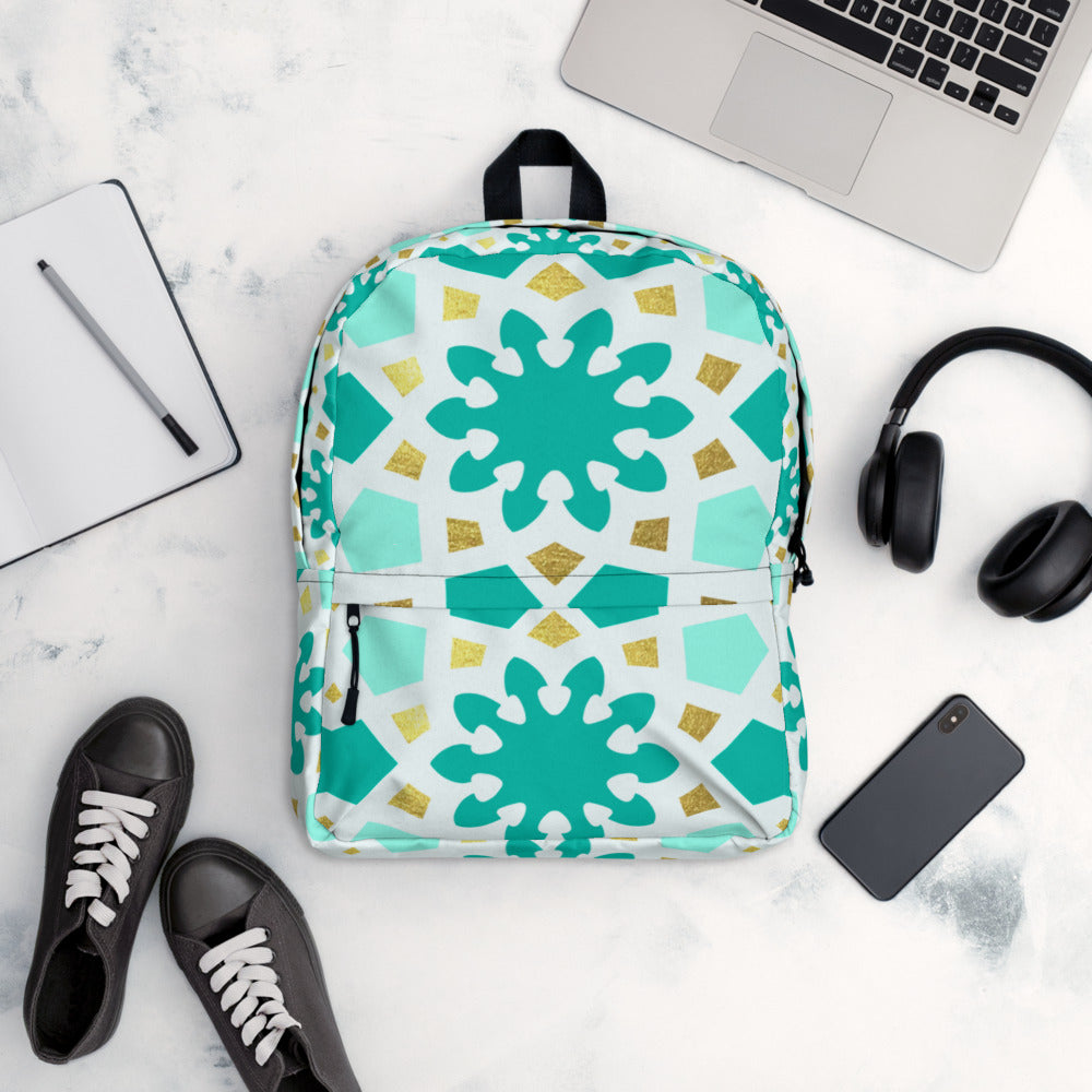 Backpack - Geometric Arabesque Pattern in Mint and Gold