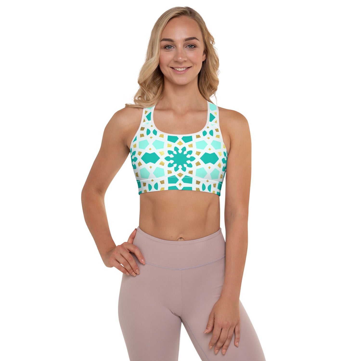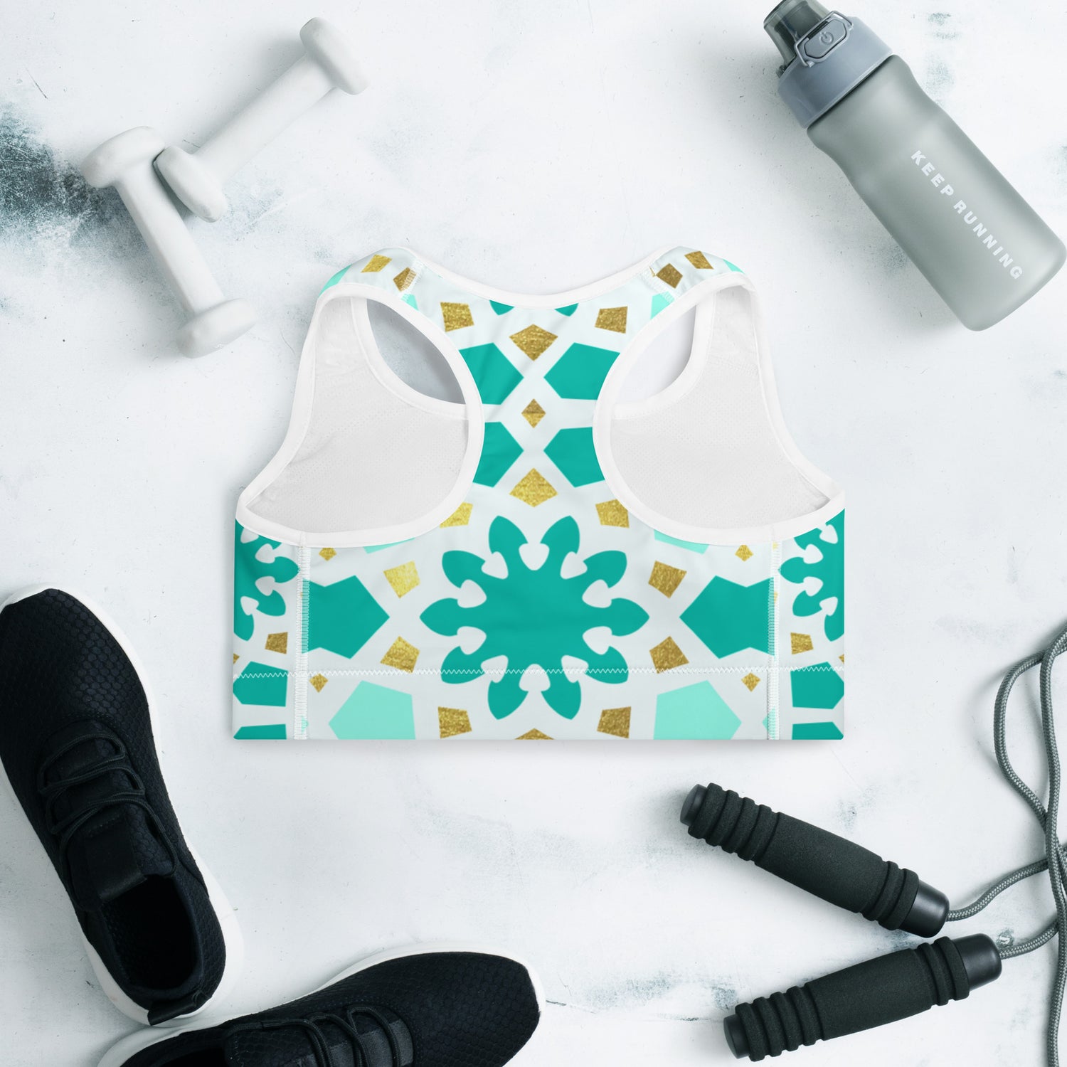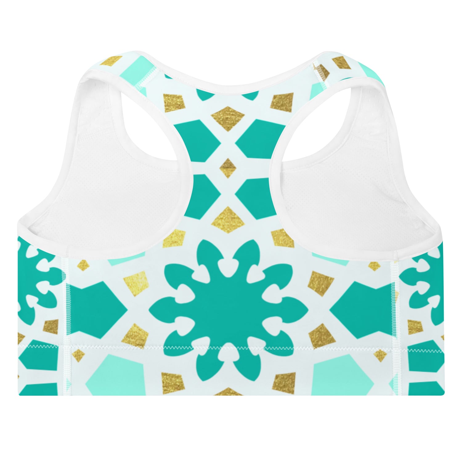 Padded Sports Bra - Geometric Arabesque Pattern in Mint and Gold