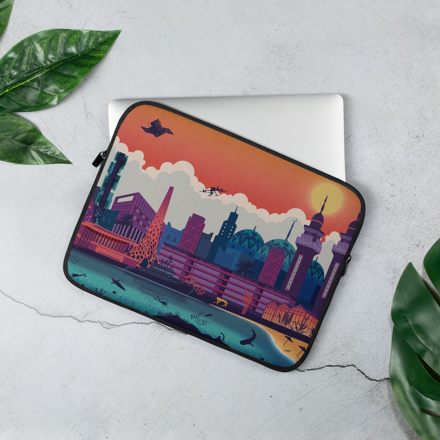 Protect your laptop in style—get this snug, lightweight laptop sleeve featuring the KAUST skyline in rich colors taken directly from the artists own photos of the Saudi Sunsets over the Red Sea! This artwork weaves meaningful architectural university and community landmarks with groundbreaking research from the brilliant KAUST academics.