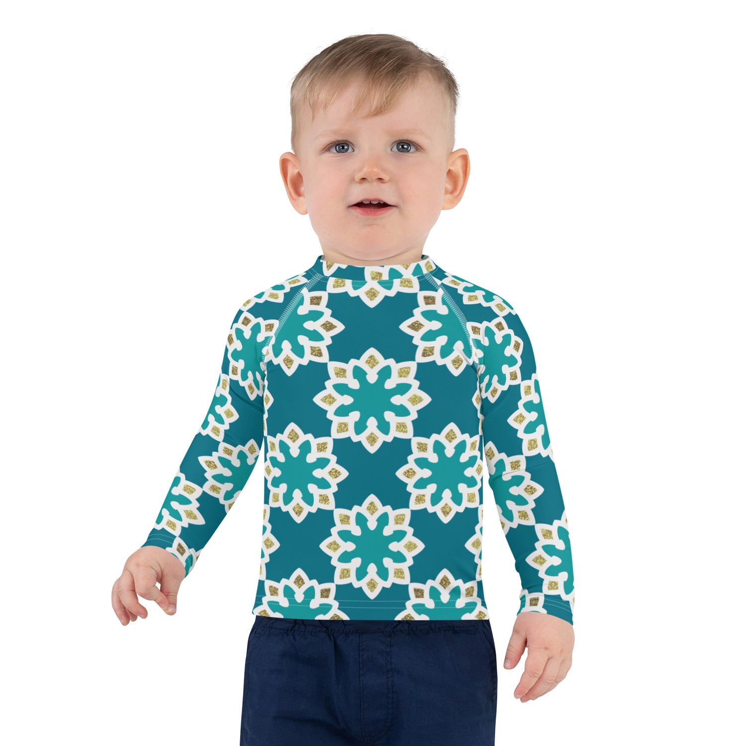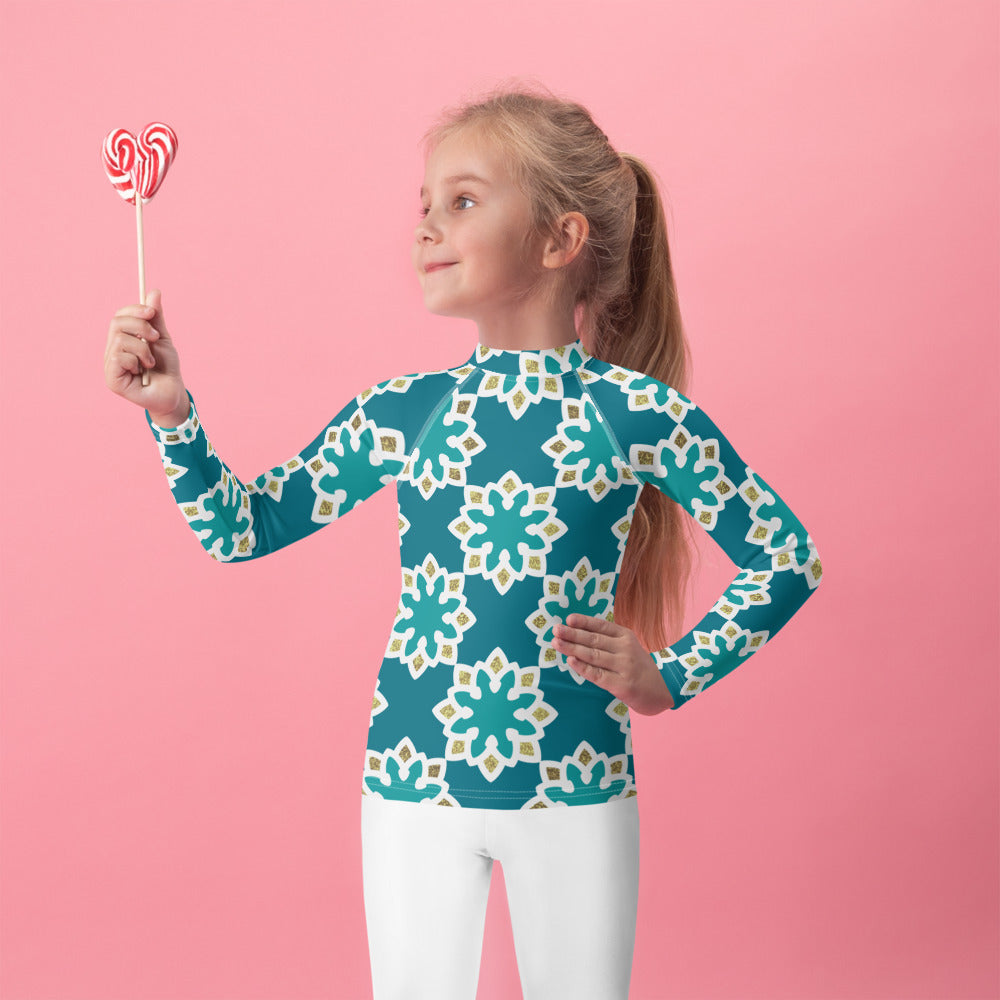 Kids Rash Guard 2T to 7 years - Arabesque Flowers in Aqua and Gold