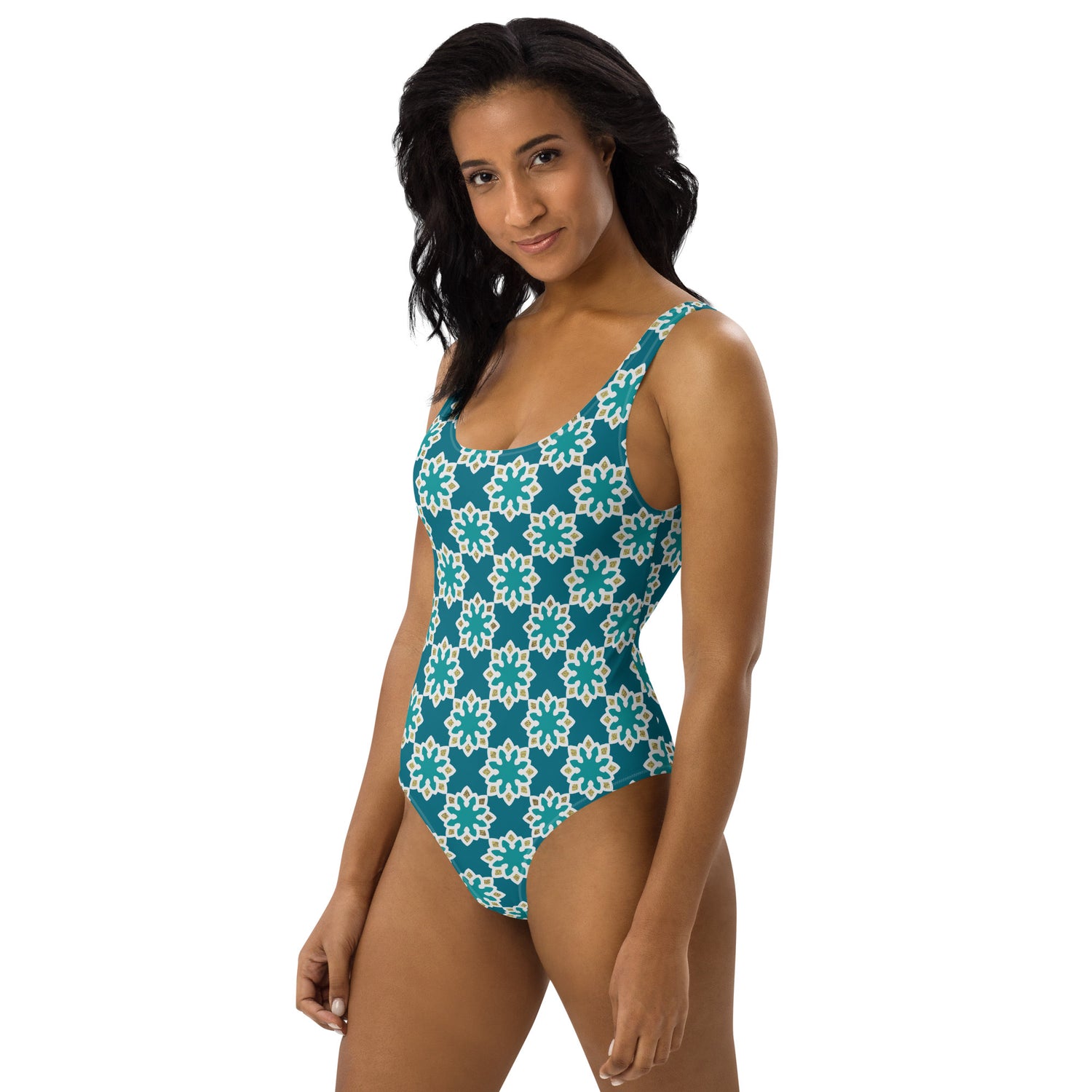 One-Piece Swimsuit - Arabesque Flowers in Aqua and Gold