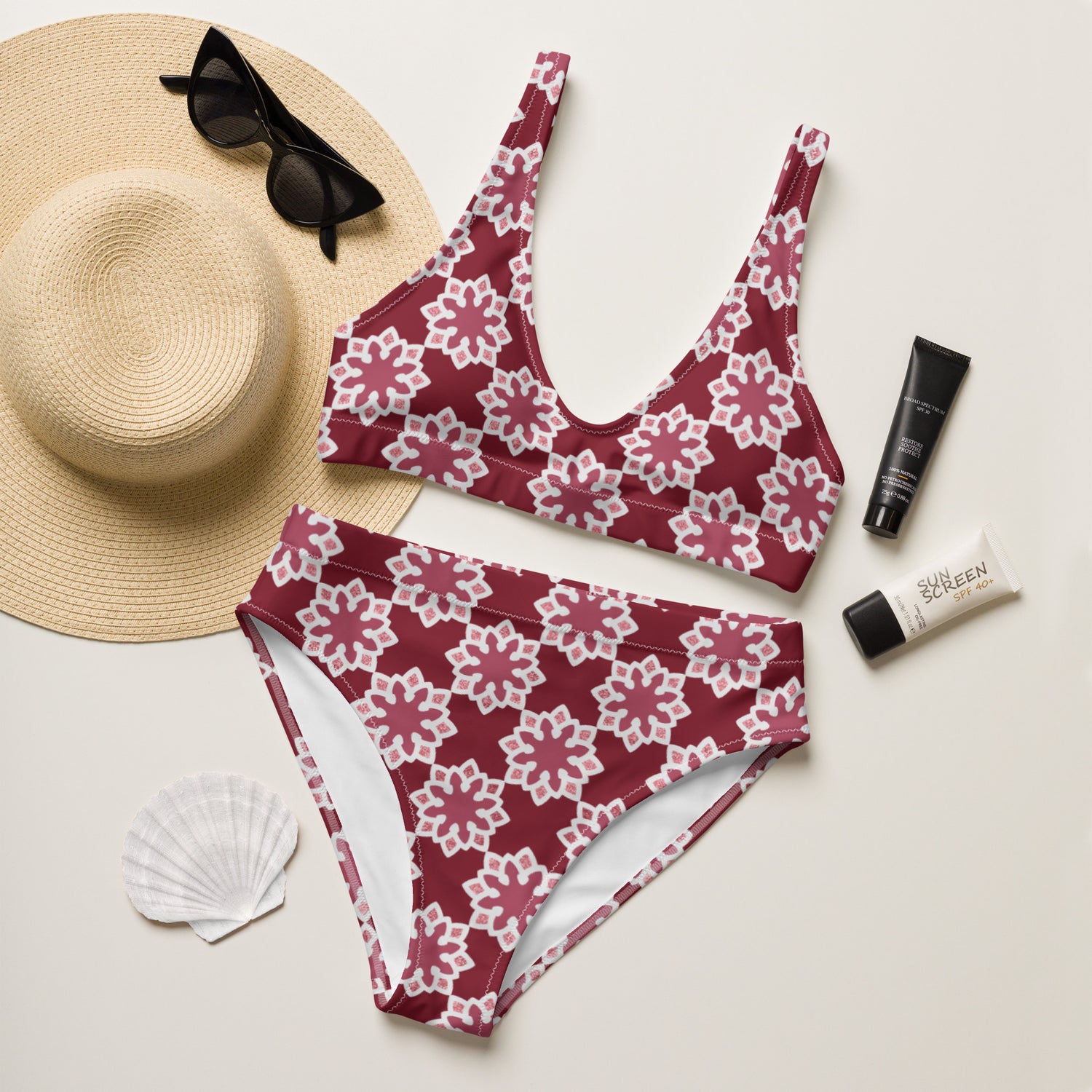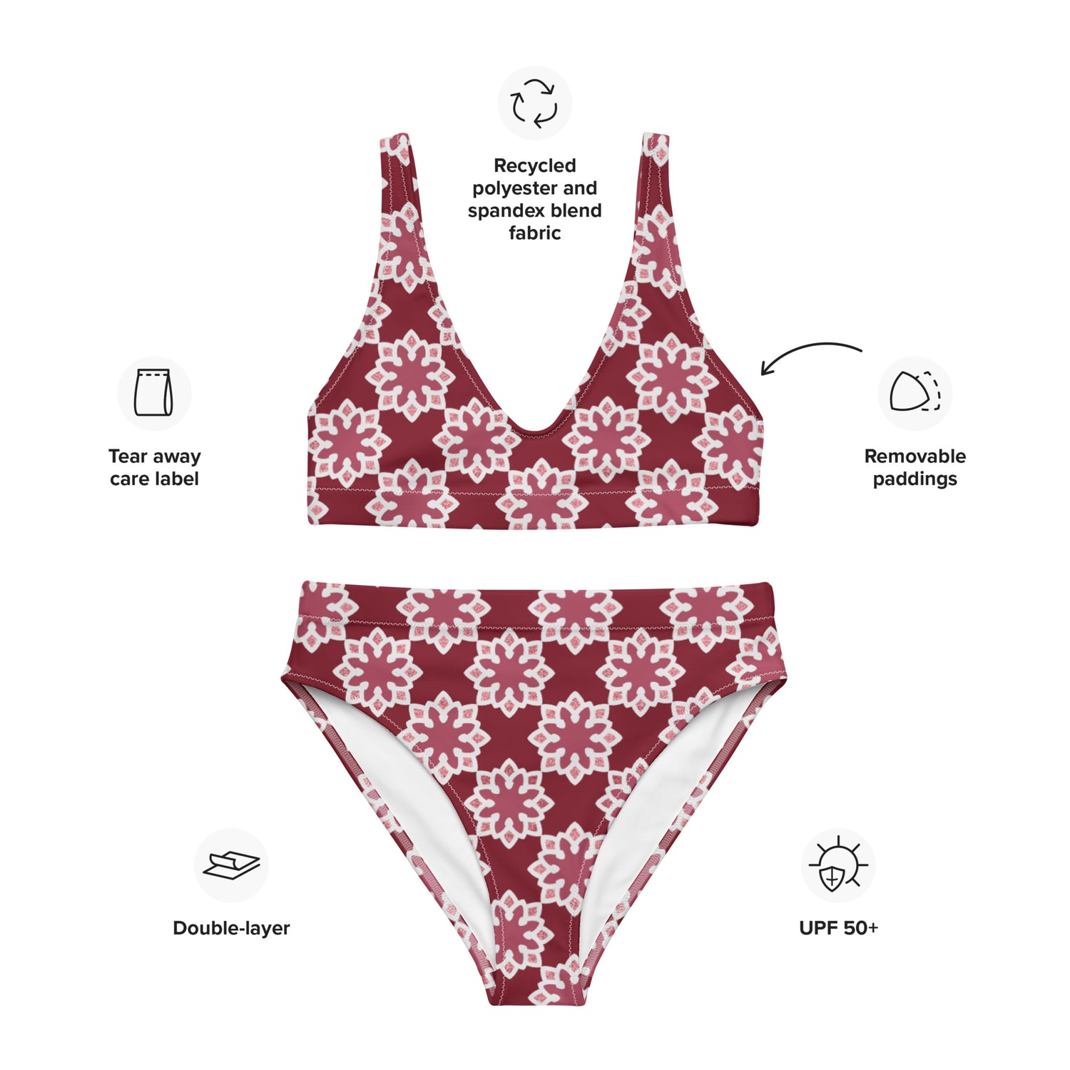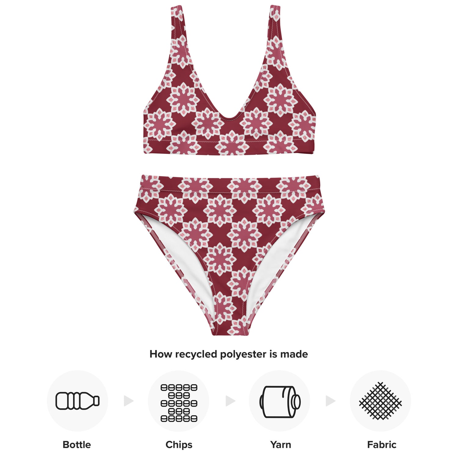 Recycled rPET high-waisted bikini - Arabesque Flower in Rouge 🍃