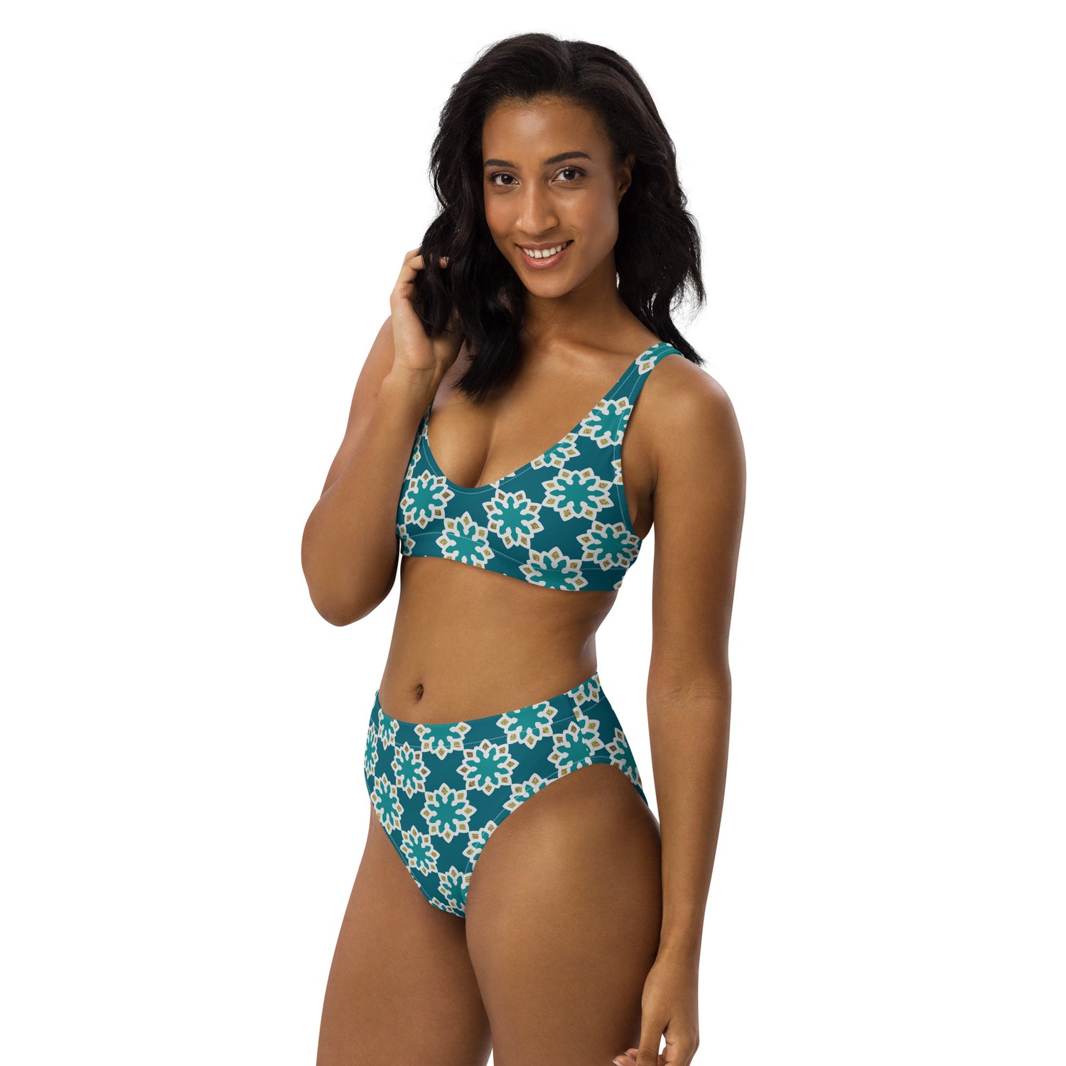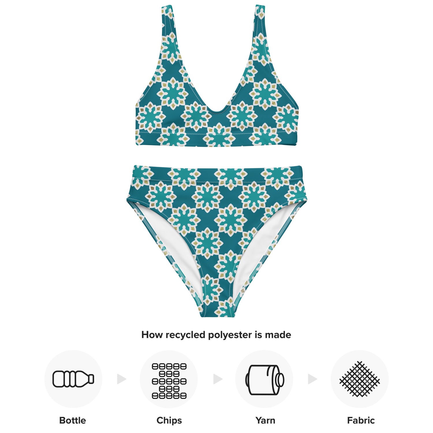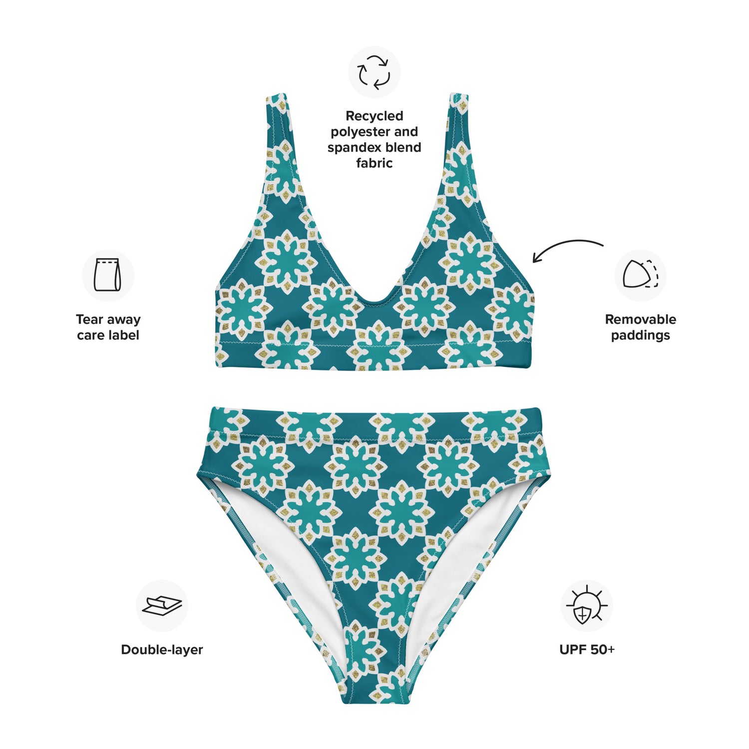 Recycled rPET high-waisted bikini 🍃 Arabesque Flowers in Aqua and Gold