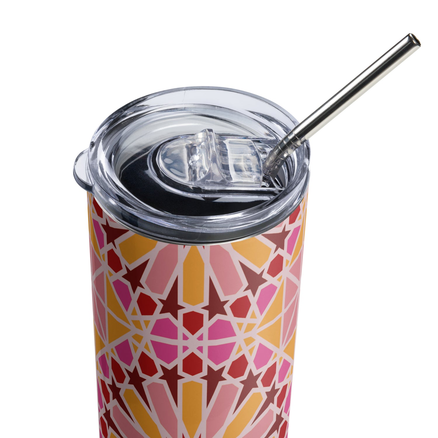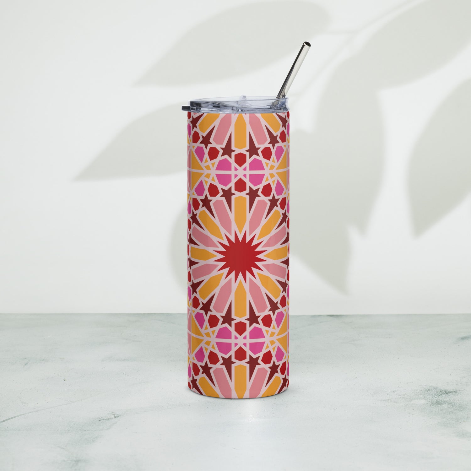 We've infused a traditional Arabic geometric design with a bright modern color palette to create a culturally rich piece of art. If you're looking for a unique and visually striking addition to your day, our hot/cold stainless steel tumbler is the perfect choice. Indulge some usable artwork, that celebrates the beauty of cultural diversity.