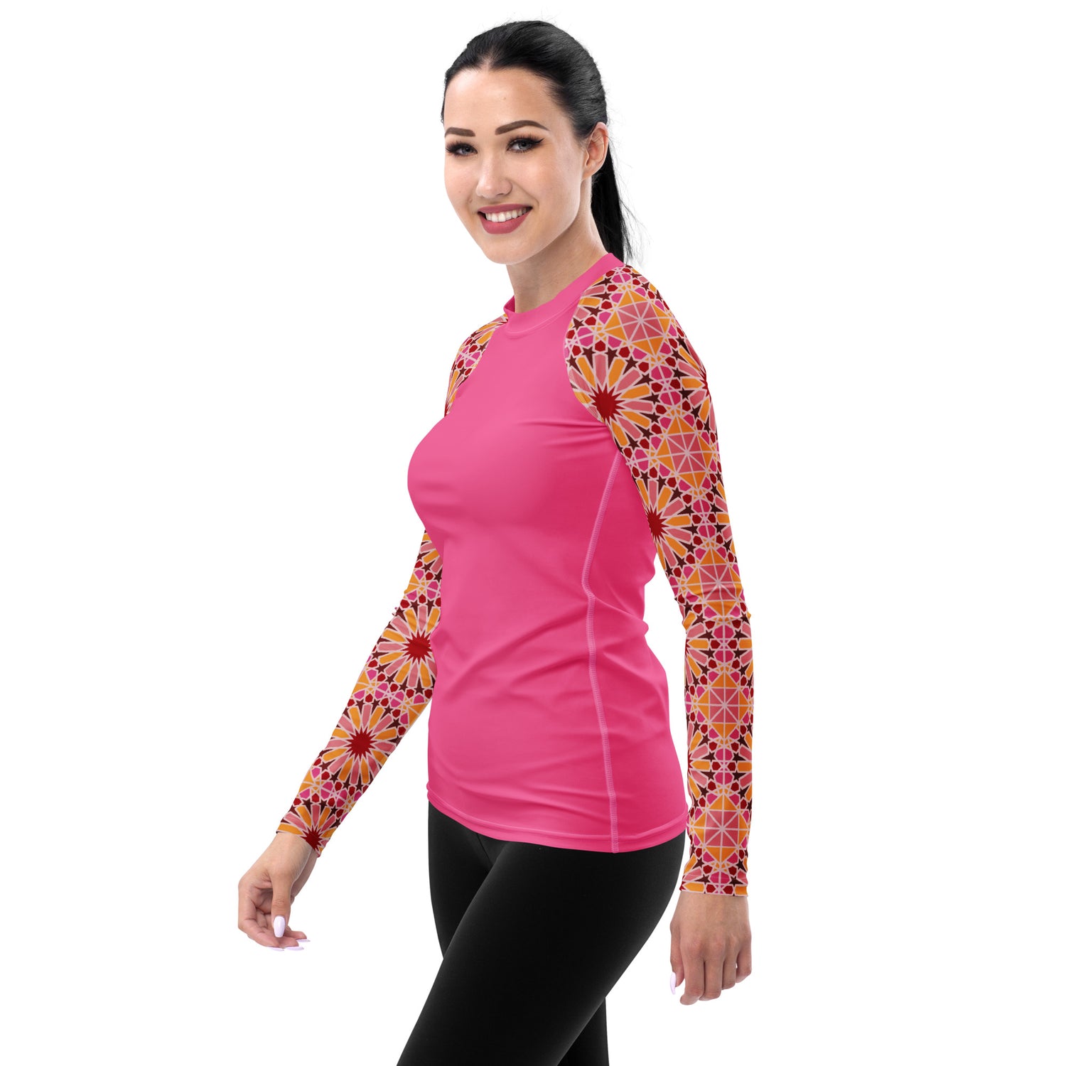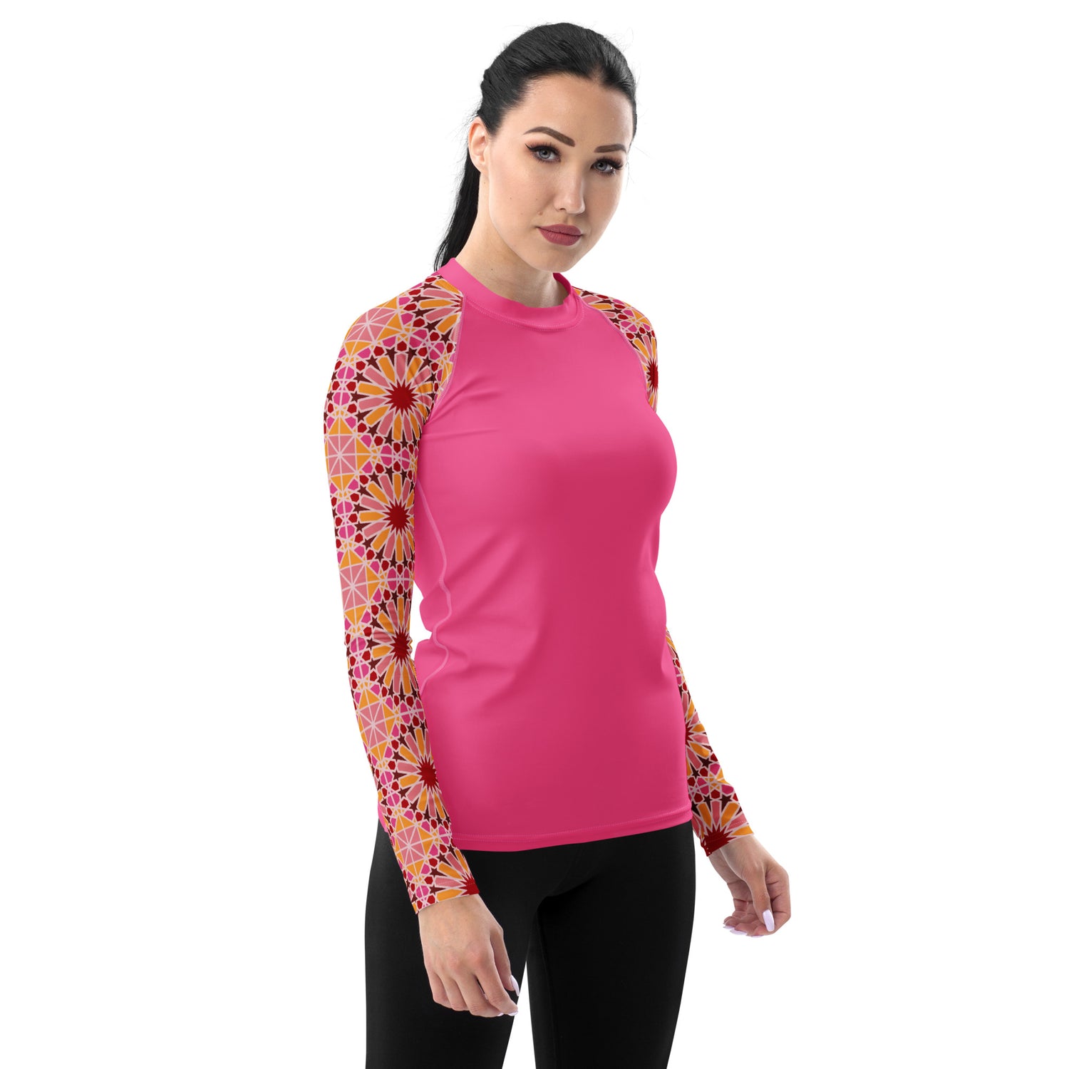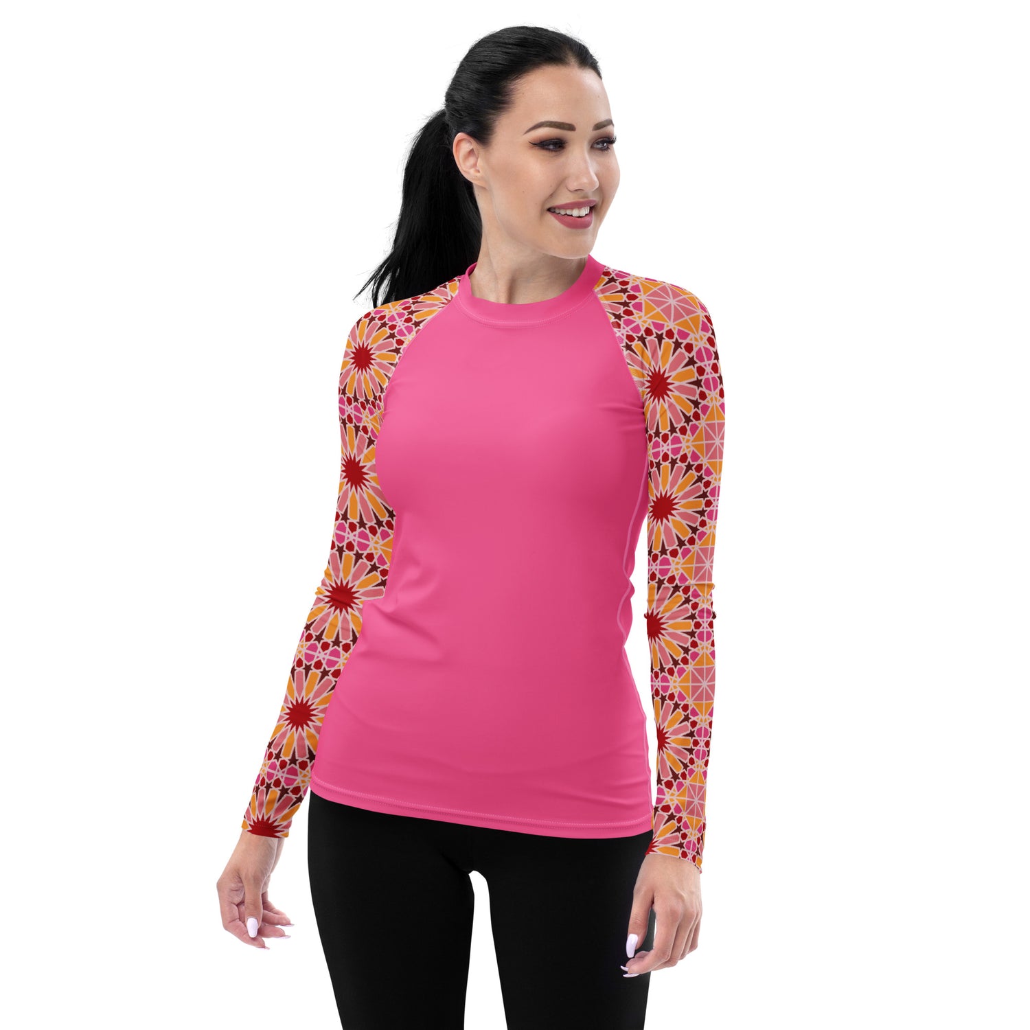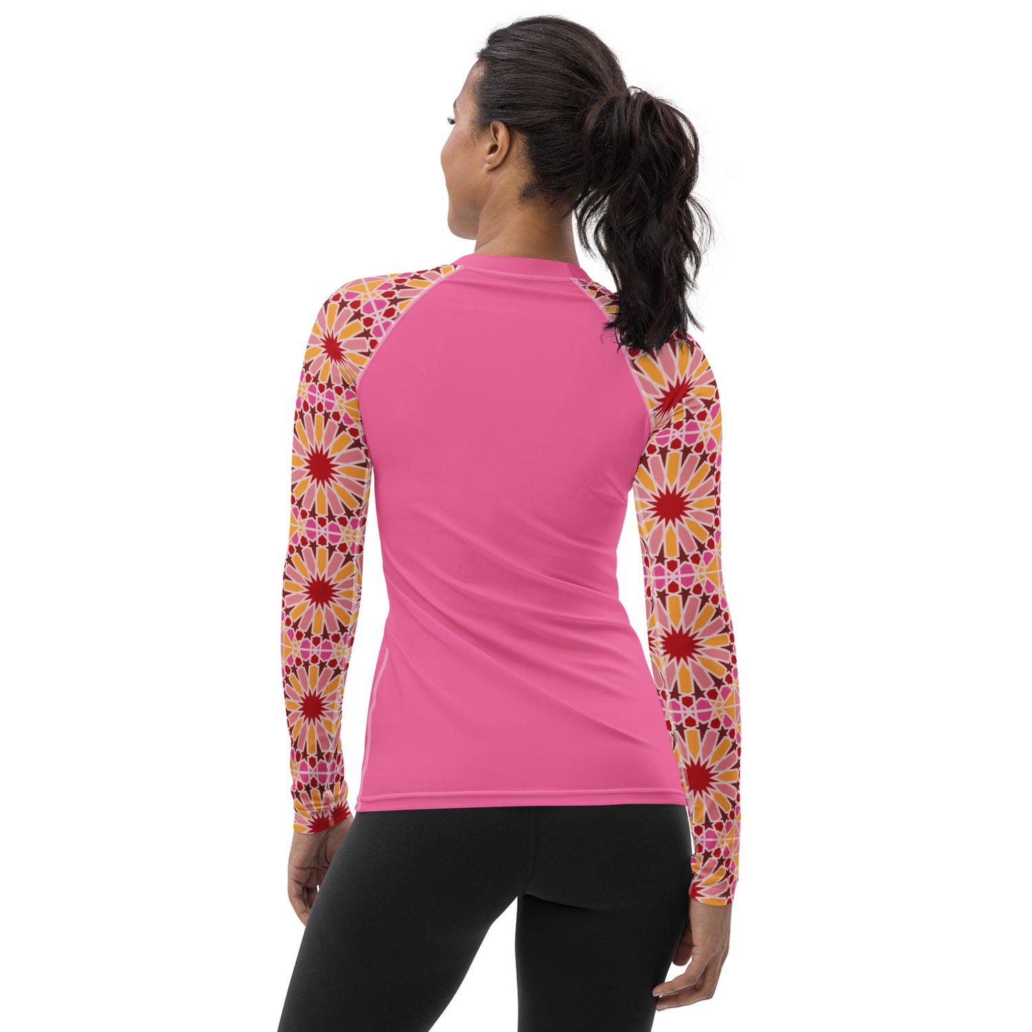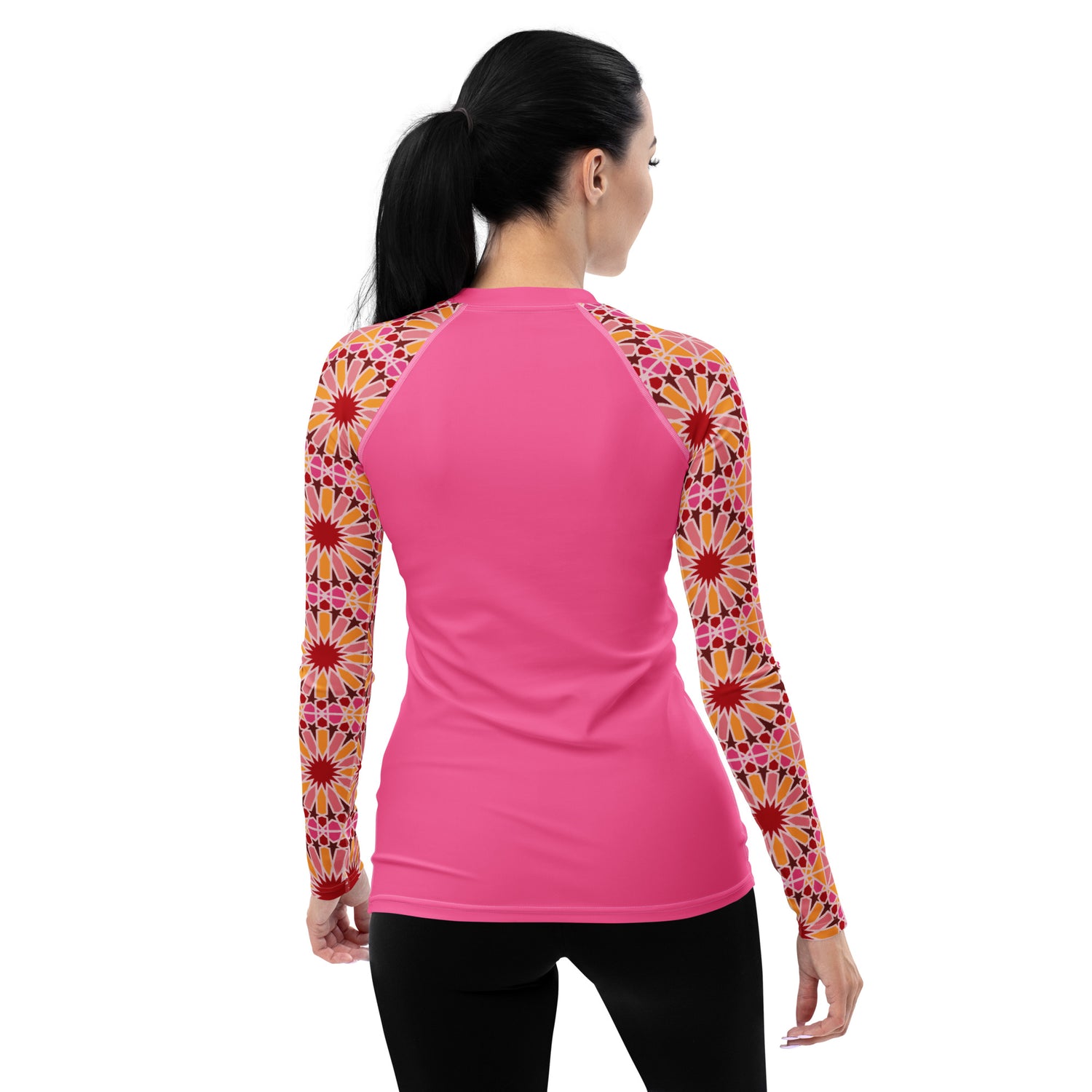 We've infused a traditional Arabic geometric design with a bright modern color palette to create a culturally rich piece of art. If you're looking for a unique and visually striking addition to your summer adventures, this Rashguard is the perfect choice.