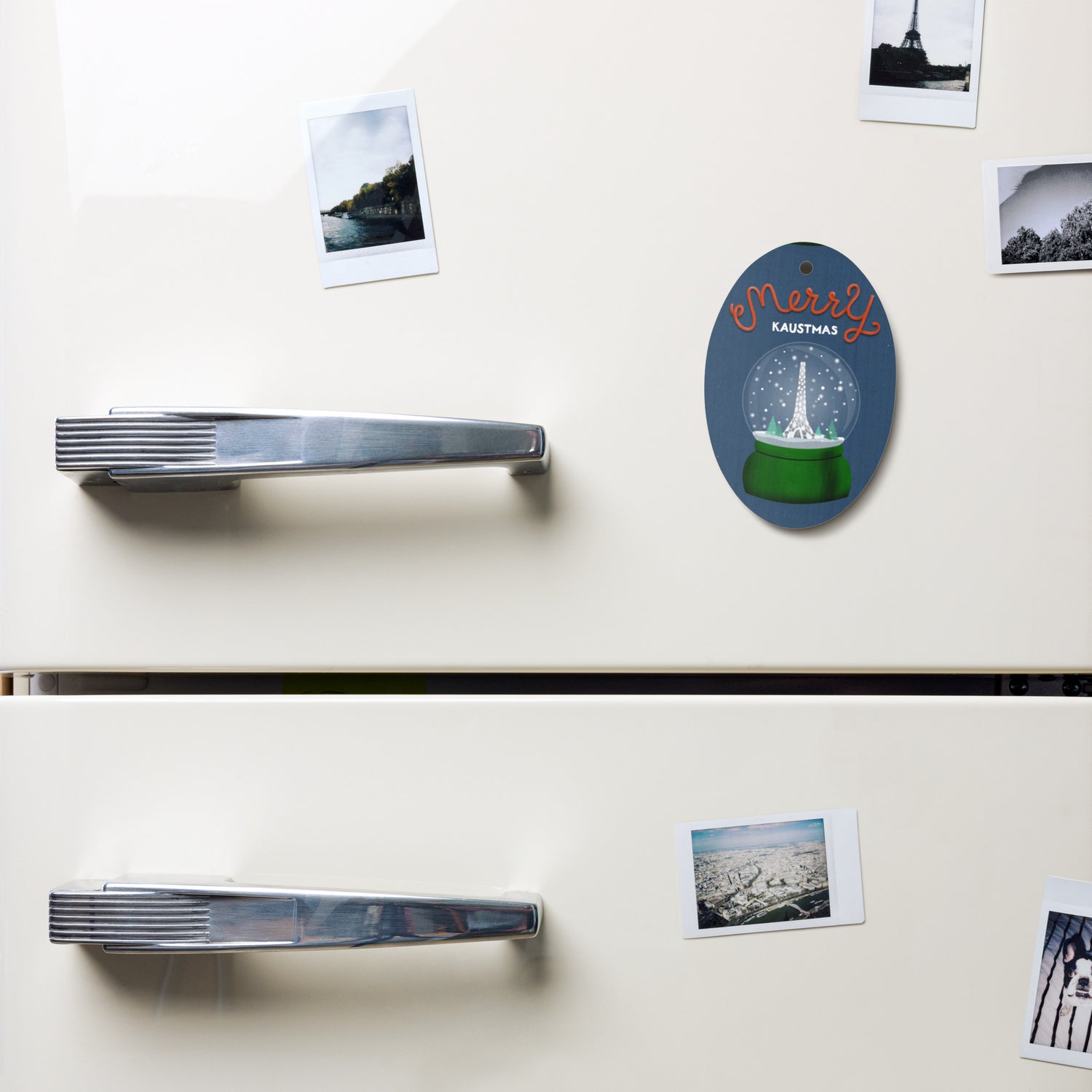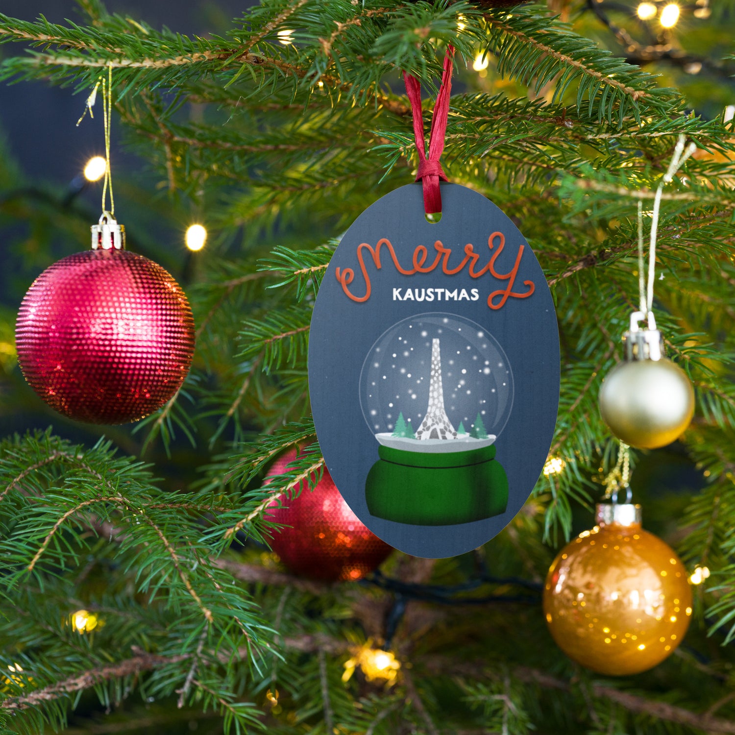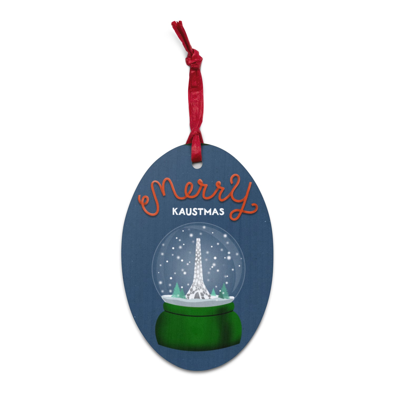 Wooden Holiday Ornaments - Merry KAUSTmas Beacon Snow Globe