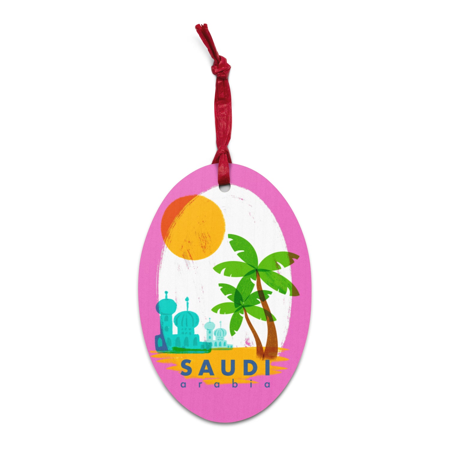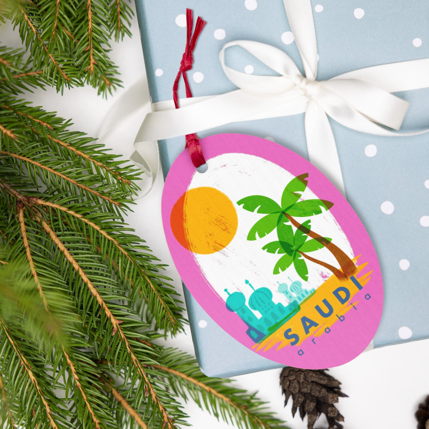 NOTE SHIPPING LOCATIONS BELOW Add a cozy vibe to your home with these double-sided wooden ornaments. Made from Hinoki wood, they’re durable yet lightweight and soft to the touch and an easy to travel gift item to bring home with you over the holidays featuring a stylized Saudi scene with traditional domed buildings, the iconic palms, gold sun and desert sands.